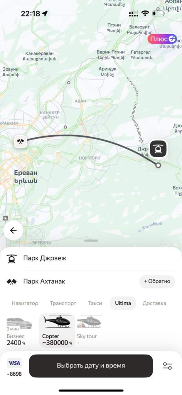 Полет индивидуальному маршруту из точки А в точку Б / © «Яндекс» Однако услуга работает только в Армении. Авиаперевозки выполняет партнер сервиса — компания Armenian Helicopters. Полет можно заказать, как минимум за два часа до вылета и максимум за месяц. Услуга предоставляется только в светлое время суток при подходящих погодных условиях.