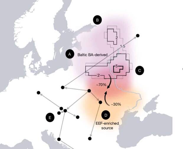 Славянам в этом смысле не везло: после миграции германцев грамотность в Европе так упала, что первые века славянских миграций слабо отразились в письменных источниках. Византийцы зафиксировали массовые нашествия славян на Балканах с VI века нашей эры, но что творилось к северу от этого региона, они не знали: народы там были враждебны и бесписьменны. Поэтому уже летописец Нестор в «Повести временных лет» задался вопросом о прародине славян, но смог лишь предположить Дунай, не имея никаких твердых данных. Генетика, уже решившая сходные вопросы для индейцев в Полинезии или индоевропейцев, со славянами забуксовала: в первые века их экспансии те практиковали трупосожжение, после которого ДНК сохранялась очень плохо. Теперь группа европейских ученых при ведущей роли германских исследователей смогла отобрать и сравнить между собой 555 геномов славян первых веков их экспансии. Итоги их научной работы опубликовали в Nature. Ученые пришли к выводу, что миграция славян не была экспансией чисто языковой или культурной: 80 процентов генов в современных Восточной Германии, Польше и Хорватии, откуда получили большую часть образцов, в V-VIII веке подверглись полной замене. То есть славянская экспансия была массовым переселением, по сути, демографическим взрывом с резким расширением ареала обитания для носителей славянских генов. Если более ранние исследования полагали, что в Польше генетический состав популяций в эпоху экспансии славян не менялся, то в новой работе все иначе: до славян в Польше население было похоже на людей из Северной Германии, Голландии и Скандинавии (то есть неславян). Получается, что новые результаты «закрывают» некогда популярную в Польше теорию о том, что родиной славян была именно ее территория. Исследователи также обнаружили, что до славян 15-25 процентов жителей территории современной Восточной Германии имели гены италийских народов того же периода (Римской империи). Это неожиданно, поскольку восточногерманские земли никогда не входили в Римскую империю и не граничили с ней. Как они туда попали — неясно, но основная часть притока шла через женщин. Возможно, их угоняли в рабство из римских земель в варварские. В любом случае с VI века все это разнообразие стирается почти полностью. От северо-западной Украины и Польши (заменено новой волной 93 ± 3 процента генофонда) до Восточной Германии (83 ± 6 процентов) установилось генетическое однообразие, больше всего похожее на гены современных белорусов и поляков. Аналогичное происходит на Балканах (82 ± 1 процент) и Волжско-Окском междуречье (будущая Северо-Восточная Русь, 65 ± 4 процента всех генов заменено). На прежних жителей этих земель гены «пришельцев» не были похожи. Родина славян в период около начала нашей эры должна была лежать в зоне, окрашенной оранжевым. Это территория сегодня в основном лежит на севере Украины, близ Киева, в меньшей степени относится к южной Белоруссии / © Joscha Gretzinger et al. Наивысшая концентрация генов, которые принесла славянская экспансия, сегодня наблюдается на Украине, в Белоруссии и Польше. К востоку (Россия) и югу (южные славяне) концентрация убывает. В то же время многие популяции, традиционно относящиеся к неславянским народам, генетически оказались похожи на славян. Сорок процентов жителей Саксонии именно таковы, а среди живущих в Германии лужицких 