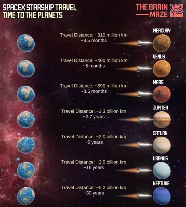 © The Brain Maze Согласно расчетам The Brain Maze, время полета Starship варьируется от короткого 3,5-месячного путешествия к Меркурию до примерно 30-летнего полета до Нептуна.