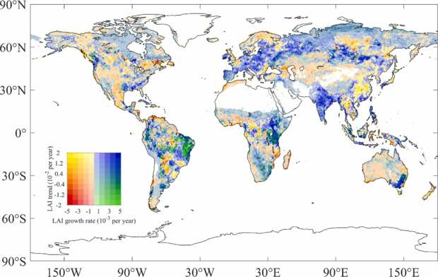 На протяжении десятилетий многие исследователи утверждали, что глобальное потепление приведет к засухе и перегреву джунглей в этих зонах, в особенности амазонских. Только в прошлом году авторы одной из таких работ прогнозировали коллапс примерно половины этих лесов уже к 2050-му. Но еще в 1980-х советский климатолог Михаил Будыко предсказал обратное: что в результате антропогенных выбросов углерода и потепления биосфера планеты испытает бум и расцвет. Международная группа ученых решила на месте проверить, что происходило с параметрами деревьев в амазонских джунглях в последние десятки лет, когда выбросы углекислого газа достигли исторического максимума. Их работу опубликовали в Nature Plants. Они просмотрели данные наблюдений за 188 участками зрелой амазонской сельвы между 1971 и 2015 годами. Все эти участки отслеживались не постоянно, а с перерывами, которые в среднем составляли около трех лет. Оказалось, что средняя базальная площадь деревьев тут росла на 3,3 процента каждое десятилетие, то есть за последние 30 лет выросла примерно на десяток процентов. Базальной площадью называют поперечное сечение стволов деревьев на уровне человеческой груди (его проще всего измерять в лесу). В абсолютных цифрах наибольший прирост пришелся на самые большие деревья (5,8 процента в десятилетие), но и для деревьев медианного размера он был вполне ощутимым (1,9 процента в десятилетие). Эти тенденции наблюдались в самых разных частях амазонских джунглей, на разных отслеживаемых участках. Ее причина — рост концентрации углекислого газа в атмосфере (это основной источник биомассы растений). Авторы попробовали проверить, могут ли быть причиной изменений сукцессии, то есть смена видового состава джунглей. Если предположить, что отслеживаемые участки когда-то в прошлом были вырублены местными племенами, а потом восстанавливались, это могло бы объяснить рост поперечных сечений деревьев. На практике это оказалось не так: при подобной сукцессии в тропическом лесу деревья больших размеров преуспевают, но вот базальная площадь деревьев меньших размеров падает (более крупные буквально закрывают им солнечный свет). На исследованных участках преуспевали все типы деревьев, а не только самые крупные. Исследователи констатировали, что их данные противоречат более ранним предположениям о том, что большие деревья в джунглях и мире в целом должны уменьшаться в числе из-за их большей уязвимости к засухам и ветровалу. Напомним, что многие ученые связывали и связывают потепление с учащением засух, хотя на практике ситуация иная. Увеличение индекса площади листьев за 2001-2020 годы (упрощенно говоря, собственно площади листьев) в различных районах мира, в тысячных долях в год. Красных зон нет даже в эпицентрах крупных лесных пожаров в Сибири, синих зон немало. Причем они есть в тех частях европейской России, где люди в XXI веке забрасывали поля, а равно и в южной Австралии, где площадь сельхозземель не росла. В Амазонии упадка растительности тоже не наблюдается, несмотря на вырубки в последние 20 лет. Как теперь понятно, индекс площади листьев, оцениваемый со спутников, недостаточно отражает процесс роста биомассы в условиях плотных тропических лесов / © Xin Chen et al. В конце работы ученые сделали утверждение, что в будущем картина может измениться и джунгли могут, по каким-то необо
