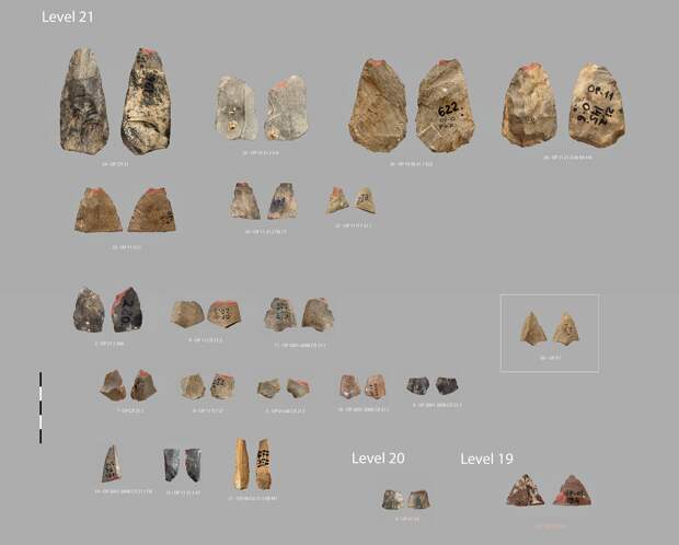 Каменные наконечники охотничьих орудий (в том числе, стрел) возрастом 80 тысяч лет / © PloS One Как отмечается в публикации в научном журнале PloS One, находки были сделаны на территории грота Оби-Рахмат — многослойного охотничьего лагеря с мощностью культурных отложений до 10 метров. Это охватывает период от 40 до 80 тысяч лет назад.