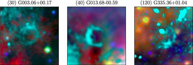 Есть в нашей Галактике и другие объекты, которые создают эффектные облака. Например, некоторые очень «тяжеловесные» светила начинают терять свое вещество еще до того, как взорвутся сверхновыми, а в конце своего основного эволюционного цикла пребывают в тучах собственной пыли. Их называют звездами Вольфа — Райе в честь их первооткрывателей, Шарля Вольфа и Жоржа Райе. Бывает также, что белый карлик, то есть бывшее ядро небольшой звезды вроде Солнца, поглощает вещество своего компаньона в двойной системе, в конце концов от этого вспыхивает и тоже оставляет после себя характерную туманность. Наконец, в Млечном Пути наблюдают множество областей звездообразования — плотных газопылевых скоплений, в которых формируются новые светила и их планеты. Недавно в Галактике обнаружили 164 новых объекта, которые пока не удается с уверенностью приписать ни к чему из вышеперечисленного. О них международная команда астрономов рассказала в статье для издания Monthly Notices of the Royal Astronomical Society. Объекты имеют форму колец, но ни их размеров, ни расстояний до них определить не удается. Все эти объекты прослеживаются в галактической плоскости, а больше всего их в окрестностях центра Млечного Пути. Это важный аргумент в пользу того, что все-таки они — или хотя бы большинство из них — находятся внутри Галактики, а не где-то намного дальше. Впервые эти объекты заметили во время наблюдений с помощью расположенной в Южной Африке радиообсерватории MeerKAT, потом пытались рассмотреть в других диапазонах излучения. Самое интересное, что в некоторых случаях это не удалось: кольца «видны» только через радиотелескоп. Примеры обнаруженных кольцевых структур, которые прослеживаются только в радиодиапазоне / © C. Bordiu et al, 2025 По поводу них остается подозревать, что они лишь кажутся расположенными в Млечном Пути, а на самом деле представляют собой другие, более далекие, «фоновые» галактики. Несколько лет назад в космосе начали находить так называемые странные радиокруги (Odd Radio Circles), которые окружают собой некоторые галактики. Не исключено, что несколько обнаруженных объектов — именно они. Рассматривается и версия гравитационных линз — эффекта, который создается притяжением очень массивного объекта. Например, целого галактического скопления. Его гравитация сильно искривляет и увеличивает изображение оказавшейся позади него галактики, и она предстает в виде дуги или даже целого кольца. Впрочем, примерно половина колец все же испускает, например, инфракрасное излучение. Это позволяет подозревать изобилие пыли, типичное для сброшенных звездных оболочек и «колыбелей» рождающихся светил. Кроме того, в центре примерно 40% объектов нашли центральные источники — возможно, пульсары, белые карлики или другие звезды. Тем не менее даже для этих объектов данных пока слишком мало для четкого понимания, что именно они представляют собой. В общей сложности ученые предварительно классифицировали 93 радиокольца.