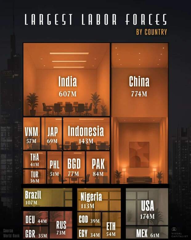 Инфографика: В каких странах мира больше всего рабочей силы / © Visual Capitalist Рабочая сила — важный показатель демографии и экономического потенциала. По данным Всемирного банка, Азия доминирует в мировой рабочей силе. Именно в Азии расположены две страны с наибольшим количеством работников — Китай (774 миллиона) и Индия (608 миллионов).