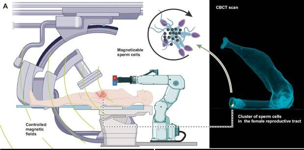 Основная проблема, которая мешала их использованию, — невидимость. Сперматозоиды слишком малы, имеют низкую плотность и почти прозрачны для рентгеновских лучей. Поэтому отследить их движение внутри тела с помощью стандартных неинвазивных методов было невозможно. Существующие оптические подходы либо требовали хирургического вмешательства, либо были ограничены малой глубиной проникновения, что не подходит для изучения процессов в человеческом организме. Команда ученых из Нидерландов и Канады нашла решение этой проблемы. Результаты опубликованы в журнале npj Robotics. Исследователи использовали неживые бычьи сперматозоиды, которые послужили биологической основой для микророботов. Сначала клетки сгруппировали в кластеры, затем покрыли их наночастицами оксида железа. Этот процесс основан на электростатическом самособирании — частицы сами притягиваются к поверхности сперматозоидов. Наночастицы выполняют сразу две функции: делают кластеры восприимчивыми к внешним магнитным полям и достаточно плотными для поглощения рентгеновского излучения. Готовых микророботов поместили в заполненную жидкостью анатомическую модель женской репродуктивной системы, напечатанную на 3D-принтере. Для управления роботами задействовали роботизированный манипулятор с постоянным магнитом. Он создавал вращающееся магнитное поле, которое заставляло кластеры катиться вдоль внутренних поверхностей модели. Так впервые удалось одновременно управлять движением биороботов и отслеживать их перемещение в реальном времени с помощью рентгеновской флюороскопии. Во время испытаний микророботы продемонстрировали высокую управляемость. Их успешно провели по всей модели: от шейки матки через ее полость до правой или левой маточной трубы. Весь путь занимал менее 50 секунд. Скорость движения кластеров зависела от частоты вращения магнитного поля. При увеличении частоты от двух до 10 герц средняя скорость роботов возрастала до 8-12 миллиметров в секунду. Дальнейшее увеличение частоты приводило к тому, что кластеры начинали распадаться на более мелкие части. Исследователи протестировали три разные концентрации магнитных наночастиц: один, два и три миллиграмма на миллилитр. Все они оказались достаточными как для надежного управления, так и для четкой визуализации с помощью рентгена. Также проверили биосовместимость роботов. Кластеры в течение 72 часов контактировали с культурой клеток эндометрия человека. Тесты показали, что они не вызывают значительной токсичности — жизнеспособность клеток сохранялась на уровне от 74% до 88%. Эта работа показала принципиальную возможность создания управляемых и видимых внутри тела биороботов на основе сперматозоидов. В будущем такая технология может привести к разработке новых методов целевой доставки лекарств для лечения заболеваний матки или маточных труб, например эндометриоза, миомы или рака. Тем не менее технология находится на самом раннем этапе развития, до ее клинического применения еще далеко. Эксперименты проводили в жесткой пластиковой модели, которая лишь имитировала анатомию, но не воспроизводила сложную среду живого организма с его мягкими тканями, потоками жидкости и иммунной системой. Распад кластеров на части при движении остается серьезной проблемой. Таким образом, рассуждения о лечении 