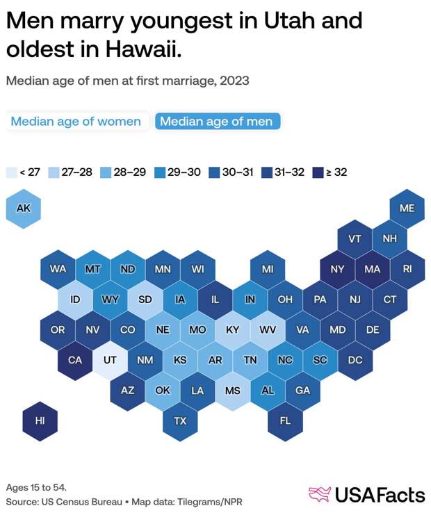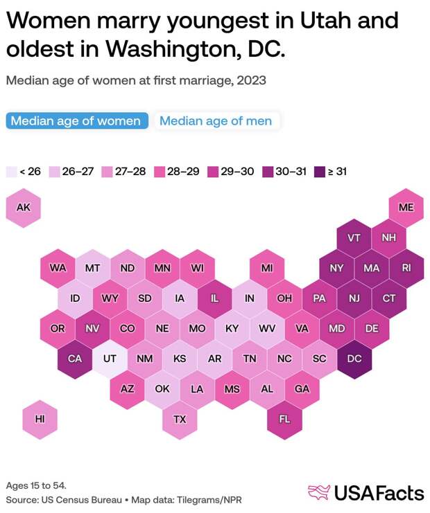 Средний возраст вступления в брак варьируется в зависимости от штата. В 2023 году мужчины и женщины наиболее рано вступали в брак в штате Юта: женщины в среднем в 25,2 года, мужчины — в 26,8 лет. Инфографика: В каком возрасте женщины в США впервые вступают в брак, 2023 / © United States Census Bureau, USA Facts Штаты-лидеры по позднему браку различаются в зависимости от пола. Женщины позднее всего выходят замуж в Вашингтоне (31,7), а также в Нью-Йорке (30,5) и Массачусетсе (30,5). Мужчины позднее всего женятся на Гавайях (32,5 года), в Нью-Йорке (32,2) и Калифорнии (32,1). Инфографика: В каком возрасте мужчины в США впервые вступают в брак, 2023 / © United States Census Bureau, USA Facts С 2021 года ситуация изменилась не сильно. По данным American Community Survey, Юта также лидировала среди штатов по наименьшему медианному возрасту вступления в брак. Наибольший медианный возраст вступления в брак для обоих полов оказался в Вашингтоне (31,95), Массачусетсе (31,3) и Нью-Йорке (31,2).