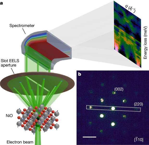 Они распространяются по материалу, подобно волнам на поверхности воды. Магноны играют ключевую роль в развивающейся области науки — магнонике. В отличие от традиционной электроники, где информацию переносят электрические заряды, магноника использует для этого спиновые волны. Такой подход обещает создание технологий следующего поколения: более быстрых, компактных и энергоэффективных. Потенциально устройства на основе магнонов могут обрабатывать данные со значительно меньшими затратами энергии, чем современные системы на основе полупроводников. Несмотря на потенциал магнонов, до недавнего времени их изучение сталкивалось с фундаментальной проблемой. Увидеть и проанализировать поведение спиновых волн на наномасштабе было практически невозможно с помощью существующих технологий. Большинство методов позволяли изучать магноны либо на больших участках поверхности, либо в большом объеме материала, но не давали информации о том, что происходит на уровне отдельных нанометровых структур. Без этого нельзя понять, как дефекты в кристаллической решетке или границы между разными материалами влияют на распространение спиновых волн, что критически важно для создания реальных устройств. Ученые из Уппсальского университета в Швеции совместно с международной командой коллег совершили прорыв в этой области, разработав новый метод для визуализации и анализа магнонов с нанометровым разрешением. Результаты опубликованы в журнале Nature. В эксперименте задействовали сканирующий просвечивающий электронный микроскоп STEM в лаборатории SuperSTEM в Великобритании. Особенность этого прибора — чрезвычайно высокое энергетическое разрешение, примерно семь миллиэлектронвольт. Такой точностью обладают всего несколько микроскопов в мире. Во время эксперимента пучок электронов пропускали через тонкий образец, нанокристалл оксида никеля, и измеряли мельчайшие потери энергии электронов. Именно эти потери несли в себе информацию о возбуждении магнонов внутри материала. a) схематическое изображение геометрии ω–q колебательных измерений методом EELS с использованием прямоугольной апертуры для сбора данных. b) экспериментальная дифракционная картина / © Demie Kepaptsoglou et.al./Nature Ключевую роль в интерпретации экспериментальных данных сыграли два теоретических метода, разработанных в Уппсальском университете. Первый — это теория TACAW, которая позволяет моделировать взаимодействие быстрых электронов с магнонами. Расчеты, выполненные с помощью TACAW, помогли точно определить, какой именно сигнал в спектре потерь энергии соответствует спиновым волнам. Теория предсказала, что сигнал от магнонов в оксиде никеля должен появиться при энергии около 100 миллиэлектронвольт, что и подтвердил эксперимент. Вторым важным инструментом стала программа UppASD для моделирования атомистической спиновой динамики. Это программное обеспечение позволило детально симулировать поведение спиновых волн в нанокристалле оксида никеля и сопоставить результаты с экспериментальными данными. Совпадение теоретических предсказаний и данных, полученных на микроскопе, послужило неопровержимым доказательством того, что ученым удалось зафиксировать именно магноны. Результаты наглядно показали, что сигнал от магнонов в тысячи раз слабее сигнала от колебаний кристаллической реш