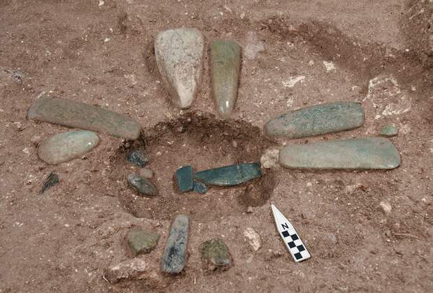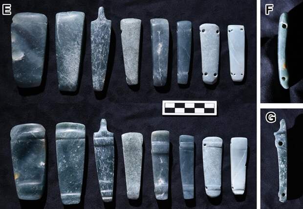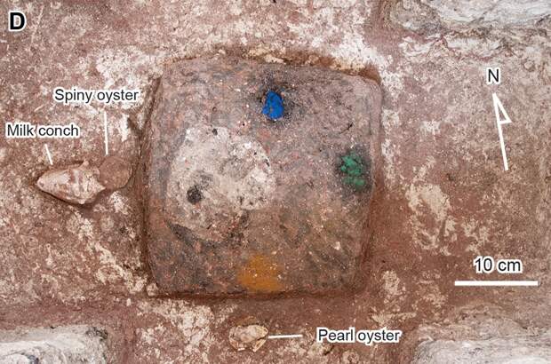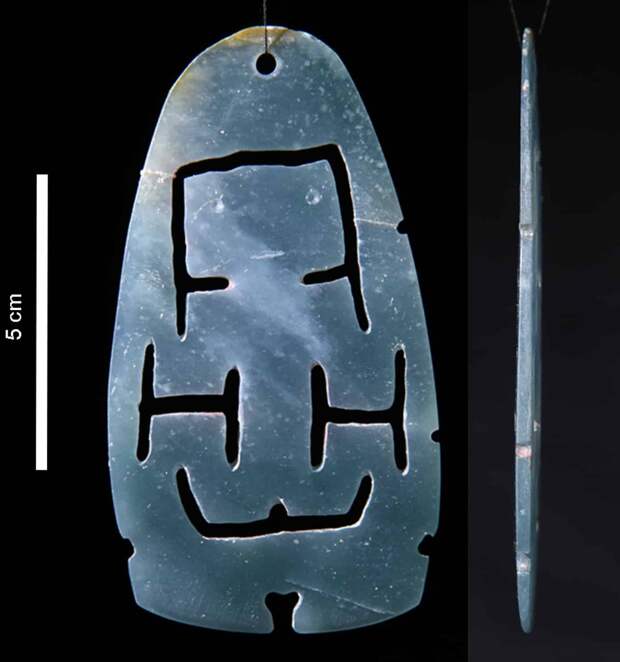 Открытие комплекса Агуада-Феникс в 2017 году поставило эту теорию под сомнение. С помощью лазерного сканирования с воздуха археологи обнаружили огромное искусственное плато, построенное примерно в 1000 году до нашей эры — почти на тысячу лет раньше известных городов. Размеры сооружения, достигающего 1,5 километра в длину, сопоставимы с более поздними центрами, а то и превосходят их. При этом, в отличие от центров ольмеков, здесь отсутствовали монументальные скульптуры, прославляющие правителей. Отсюда возник вопрос: что мотивировало древних людей участвовать в таких масштабных проектах? Авторы нового исследования попытались дать ответ, проанализировав символическое назначение комплекса. Международная команда археологов провела детальные раскопки Агуада-Феникс. В статье для журнала Science Advances ученые представили доказательства того, что весь комплекс был спроектирован как космограмма — материальное воплощение представлений о мироустройстве. Карта Агуада-Феникс, составленная с помощью лидара / © Takeshi Inomata et. al / Science Advances (2025) Анализ данных лидара показал, что планировка комплекса основана на двух осях: север — юг и запад — восток. Эти оси прочерчены по ландшафту с помощью сети приподнятых дорог и углубленных коридоров, которые расходятся от центрального плато и тянутся на расстояние до девяти километров. Главное сооружение в центре ориентировано по восходу солнца в те два дня, которые делят ритуальный 260-дневный календарь майя на равные половины. Ключевую находку сделали во время раскопок в центральной части плато. Археологи обнаружили крестообразную яму глубиной около пяти метров. На ее дне находилась еще одна яма меньшего размера, тоже в форме креста. Сначала там нашли 24 ритуальных топора из нефрита. Затем, на дне самой глубокой части, ученые увидели ритуальное подношение: цветные пигменты, разложенные по сторонам света. Синий азурит лежал на севере, зеленый малахит — на востоке, а желтая охра — на юге. Радиоуглеродный анализ показал, что тайник создали в период между 900 и 845 годами до нашей эры. Пигменты и ракушки, найденные на дне крестообразного тайника-углубления, ориентированы по сторонам света / © Takeshi Inomata et. al / Science Advances (2025) Вид одного из тайников с нефритовыми топорами / © Takeshi Inomata et. al / Science Advances (2025) Вид спереди и сбоку тонкой нефритовой пластины, найденной в центральной части тайника. Возможно, она использовалась как бляшка, подвешенная к поясу, или как кулон. По мнению авторов, она изображает женщину в позе роженицы. / © Takeshi Inomata et. al / Science Advances (2025) Две стороны нефритовых предметов с двумя поперечными отверстиями, найденных в тайнике. Возможно, они использовались вместе как повязка на голову или ожерелье. / © Takeshi Inomata et. al / Science Advances (2025) Это самое раннее известное свидетельство использования цветового символизма для обозначения направлений в Мезоамерике. Вместе с общей планировкой объекта находка показала, что весь комплекс Агуада-Феникс строили как гигантскую схему космоса. Частью этого плана была и масштабная гидросистема из дамбы и каналов шириной до 35 метров, которые, вероятно, тоже несли символическую функцию. Таким образом, план Агуада-Феникс представлял собой гигантскую космограмму, которая служила материальным воплощением Вселенной и календаря. В комплексе отсутствовали монументальные изображения правителе