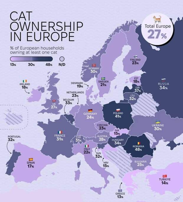 Владельцы кошек в Европе / (© FEDIAF, Arciom Antanovic По данным European Pet Food Industry Federation, в каждом четвертом домохозяйстве Европы проживает хотя бы один представитель семейства кошачьих. Самой котолюбивой страной оказалась Румыния. Там коты живут практически в половине семей (48%). Также кошки популярностью большой пользуются в Польше (41%) и Латвии (37%).