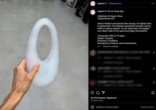Источник: соцсети Coperni The Air Swipe Bag является самым большим объектом, созданным с использованием технологии этого уникального космического наноматериала, над разработкой которого трудился профессор Иоаннис Михалудис. Источник: соцсети Coperni