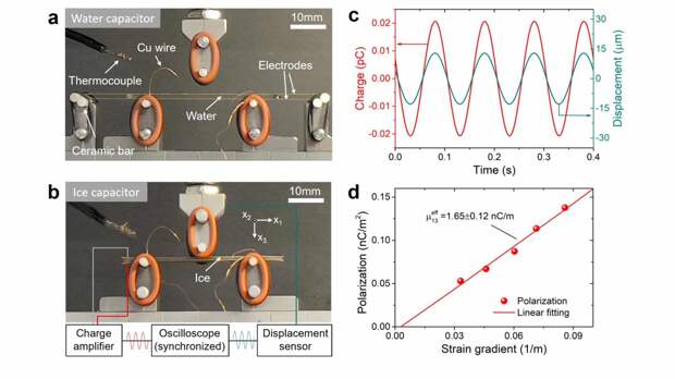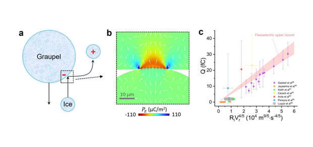 Лед между листами золота — это конденсатор, его можно включить в электрическую цепь и измерять в ней параметры всех токов. Несмотря на кажущуюся простоту, работа над изучением и описанием открытия флексоэлектрического и сегнетоэлектрического эффектов во льду заняла около трех лет. Первый препринт статьи появился в декабре 2022 года, а рецензирование она прошла лишь летом 2025-го. Среди авторов — испанские, американские и китайские физики, сотрудники Каталанского института нанонаук и нанотехнологий, Сианьского университета Цзяотун, а также Университета штата Нью-Йорк в Стони-Бруке. Фазовая диаграмма водяного льда представляет собой настоящий Клондайк для физика. Этот удивительный материал демонстрирует все новые и новые свойства при самых разных комбинациях температур и давлений. Не считая всем знакомого льда Ih, самой распространенной его формы на земле, существует не менее двух десятков его структурных разновидностей (фаз). Тем примечательнее, что в новой научной работе использовался лед Ih, вроде бы изученный вдоль и поперек. Флексоэлектрический эффект — это поляризация диэлектрика при его неоднородной деформации (изгибе). Не стоит путать его с пьезоэлектрическим эффектом — поляризацией строго определенным образом организованных кристаллов диэлектриков при деформации, — это разные явления. У льда Ih флексоэлектрический эффект экспериментально выявлен впервые. Он проявлялся от криогенных температур до нуля. По флексоэлектрическим характеристикам лед оказался близок к керамикам, которые используются в сенсорах на основе этого эффекта. Механизм «самозаряда» грозового облака. Мелкая льдинка сталкивается с более крупной (a), возникающая деформация провоцирует флексоэлектрический эффект, поляризация в результате которого показана на панели b. Панель c — сравнение измеренных параметров поляризации в грозовых облаках (разные исследования) с теми данными, которые получаются в результате симуляции такого облака с учетом флексоэлектрического эффекта / © Wen, X., Ma, Q., Mannino, A. et al. Flexoelectricity and surface ferroelectricity of water ice. Nat. Phys. (2025). https://doi.org/10.1038/s41567-025-02995-6 Кроме того, во время своих опытов ученые отметили фазовый переход на поверхности ледяного конденсатора, происходящий около отметки в 160 кельвин (минус 113 градусов Цельсия). Он проявил характерные для льда XI сегнетоэлектрические свойства — в нем произошла спонтанная поляризация, ориентацию которой можно было изменить приложением внешнего электрического поля. Какие новые практические применения могут быть у льда в свете его недавно обнаруженных флексоэлектрических свойств, ученые пока не задумывались. Но в одном это открытие точно здорово помогает всем физикам: теперь яснее становятся механизмы возникновения электрических зарядов в облаках. По мнению авторов научной работы, добавление в модели грозовых туч флексоэлектричества льдинок сделает их точнее и ближе к реальности. Но пока эту мысль они проверили только в первом приближении.