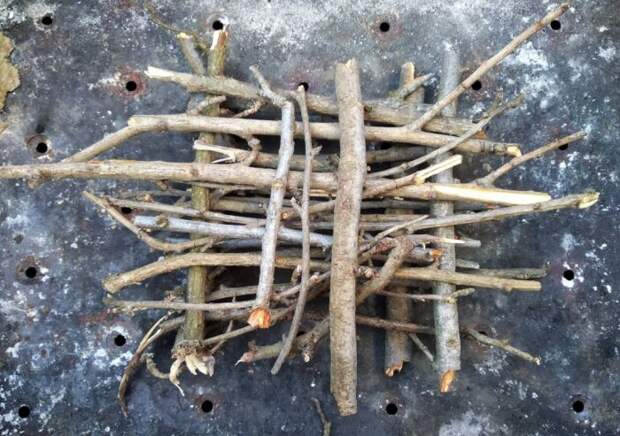 Итак, первым делом необходимо приготовить основу, для этого можно наколоть щепок, но я делаю по другому: просто подхожу к любому дереву и ломаю небольшое количество сухих веточек. Затем складываю их в мангале колодцем, в несколько рядов, много не нужно.