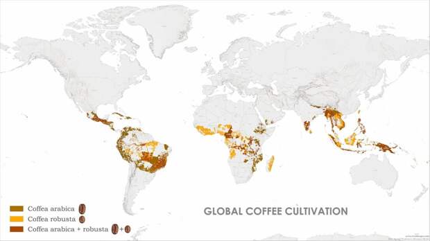 Территории, где производят сорта кофе: арабика и робуста / © vividmaps / Reddit Арабика требует особых условий и предпочитает высоты от 600 до 2000 метров, а иногда растет еще выше. Выращивать арабику — дорого и сложно. Растения подвержены болезням, и для получения качественного урожая необходимо регулярно ухаживать за кустами, удобрять почву и в некоторых районах даже строить системы искусственного полива.