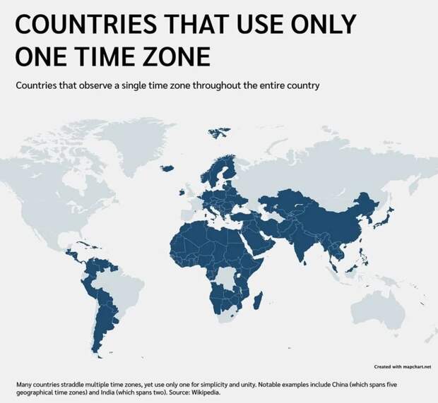 Инфографика: страны с одним часовым поясом / © wikipedia На представленной выше инфографике показаны все страны, использующие только один часовой пояс. Среди них особенно выделяются Индия и Китай. Несмотря на то, что КНР географически охватывает пять часовых поясов, во всех них используется пекинское время, которое было введено в 1949 году для национального единства.