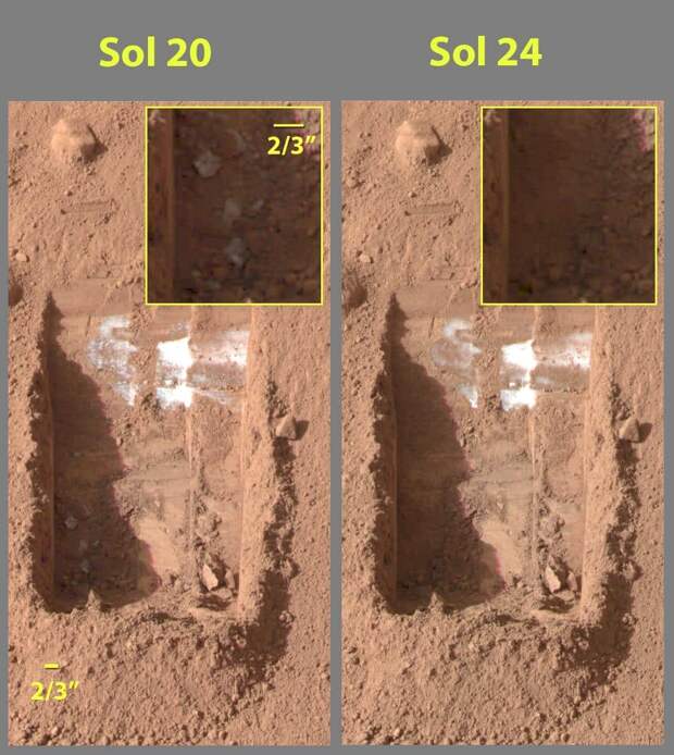Это связано с тем, что атмосфера Красной планеты очень разрежена, а магнитное поле крайне слабое, поэтому большая часть излучения доходит до поверхности, что усложняет сохранность органики и выживание организмов на открытом пространстве. Во второй половине XX века, с началом «эпохи космических аппаратов», ученые впервые увидели Марс крупным планом. Тогда же исследователи обнаружили на Красной планете высохшие русла, каньоны и отложения — признаки того, что в далеком прошлом там текла жидкая вода. Чуть позже, с помощью все тех же аппаратов, планетологи нашли большие залежи водяного льда, скрытого как под поверхностью, так и находящегося на ней. Оставался главный вопрос: что на счет жидкой воды, необходимой для жизни? Марс известен своими экстремальными условиями — ночными низкими температурами и атмосферным давлением, которое в среднем в 160 раз меньше земного. В подобных ситуациях жидкая вода не может стабильно существовать на поверхности, она будет быстро «закипать» и превращаться в водяной пар. Однако на Марсе обнаружено много солей, которые способны образовывать «солевые растворы». Такие растворы замерзают при значительно более низких температурах, чем жидкая вода, — на десятки градусов ниже нуля, а в лабораторных условиях для некоторых составов переставали замерзать при еще более низких температурах. В результате могут образовываться тонкие пленки или мелкие лужицы соленого раствора, которые остаются жидкими даже при сильном морозе. По мнению ряда ученых, такие рассолы часто временные, существуют или в защищенных нишах на поверхности (дно кратеров, теневые участки), или под слоем грунта. Открытие солей и потенциальных соленых растворов заставило исследователей пересмотреть старые модели: если на поверхности либо под ней образуются такого рода структуры, то в отдельных условиях может существовать жидкая вода, а в ней гипотетически возможна и микробная жизнь. Сублимация льда на Марсе. Снято космическим аппаратом NASA «Феникс» в 2008 году / © NASA, JPL-Caltech, University of Arizona, Texas A&M University Команда американских планетологов под руководством Ханны Сайзмор (Hanna Sizemore) из Института планетарных наук в штате Аризона решила проверить, могут ли в приповерхностных областях марсианской вечной мерзлоты существовать каналы с жидкой водой. Ученые использовали данные о составе марсианского грунта, собранные космическим аппаратом NASA «Феникс» в 2008 году, и рассчитали, сколько льда там может растаять, если в нем есть соли, которые мешают воде замерзать. Такой феномен хорошо известен на Земле. Даже в самых холодных регионах нашей планеты, между частичками льда и грунта, существуют крошечные пленки и жилки соленой воды, не замерзающей при низких температурах. Компьютерные модели показали, что если в марсианском грунте есть соли, то в нем может появляться немного жидкой воды — примерно пять процентов от всей массы. Эта вода может течь по очень узким каналам, толщина которых не превышает пяти микрометров, то есть примерно в 10 раз меньше толщины человеческого волоса. Несмотря на столь маленький размер, эти каналы достаточно большие, чтобы внутри мог поместиться микроб и получать из окружающей среды вещества, нужные для жизни. По расчетам, такие обширные сети водяных жил должны быть распространены на широтах выше 50-го градуса широты. Если микробная жиз