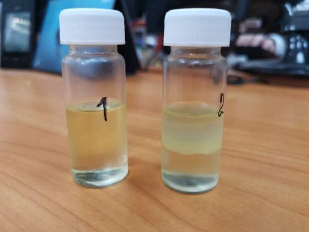 В молочной продукции вместо молочного жира используют дешевое пальмовое масло, в шоколадных конфетах, глазури на печенье и других кондитерских изделиях — подделки под масло какао. Часто под видом дорогостоящих оливковых масел, которые пользуются у россиян все большей популярностью, например, масла первого отжима – extra virgin olive oil, — продают рафинированное оливковое масло из жмыха или смеси оливкового и подсолнечного масла. Мониторинг Роспотребнадзора показал, что доля фальсификата за последние несколько лет в российских магазинах стала ниже. Например, если раньше в пастеризованном молоке были десятки процентов фальсификата, то сейчас его количество снизилось в разы. В российском сыре выявляли более 40% поддельных образцов, теперь доля фальсификата почти сошла на нет. В рыбной продукции массовые подмены (иногда свыше половины рынка) тоже ушли в прошлое. Однако подделки не исчезли. Как показывает практика, бороться с ними можно только проверками, наказывая рублем недобросовестных производителей. При этом контрольные лабораторные исследования не должны быть чрезмерно долгими и дорогими, чтобы не создавать проблем честному бизнесу. К тому же, слишком сложные методики проверки не позволяют оценить качество достаточно большого количества поступающих в магазины товаров, а значит, недостаточно защищают потребителей. Разработанная учеными Губкинского университета экспресс-методика позволяет быстро оценить состав жирных кислот и стеринов в пищевых продуктах и растительных маслах. Она дает возможность быстро проверить качество молочной продукции, оливкового масла, изделий с использованием масла какао-бобов и других популярных продуктов. Так, по составу стеринов в растительных маслах можно выявить контрафакт, где вместо масла первого отжима используется рафинированное масло или масло из жмыха. «Были проведены исследования фазовых равновесий в тройных системах при различных температурах. Результаты изучения фазовых равновесий «жидкость–жидкость» в системе «циклогексан – этанол – вода» мы предложили использовать для разработки методики определения состава стеринов – природных органических соединений, входящих в состав неомыляемого остатка жиров и масел», — рассказывает руководитель проекта, доцент кафедры физической и коллоидной химии Губкинского университета Андрей Новиков. Исследование было поддержано Российским научным фондом, учитывая его значимость для экономики и научную ценность. Пример экстракции липидов из неомыляемого остатка растительного масла: слева (виала 1) – экстракция диэтиловым эфиром; справа (виала 2) – экстракция циклогексаном с замораживанием масляной фазы / © Андрей Новиков, пресс-служба РГУ нефти и газа (НИУ) имени И.М. Губкина Анализ жирных кислот и стеринов в составе продукта позволяет точно определить, из какого сырья он был изготовлен. Грубые подделки сравнительно легко обнаруживаются по составу жирных кислот. Однако в случаях использования смесей масел приходится проводить более трудоемкие анализы состава неомыляемого остатка. Традиционно используемая методика предусматривает проведение омыления при длительном кипячении в спиртовом растворе щелочи с обратным холодильником с последующей экстракцией неомыляемого остатка, разделением фракций экстракта тонкослойной хро