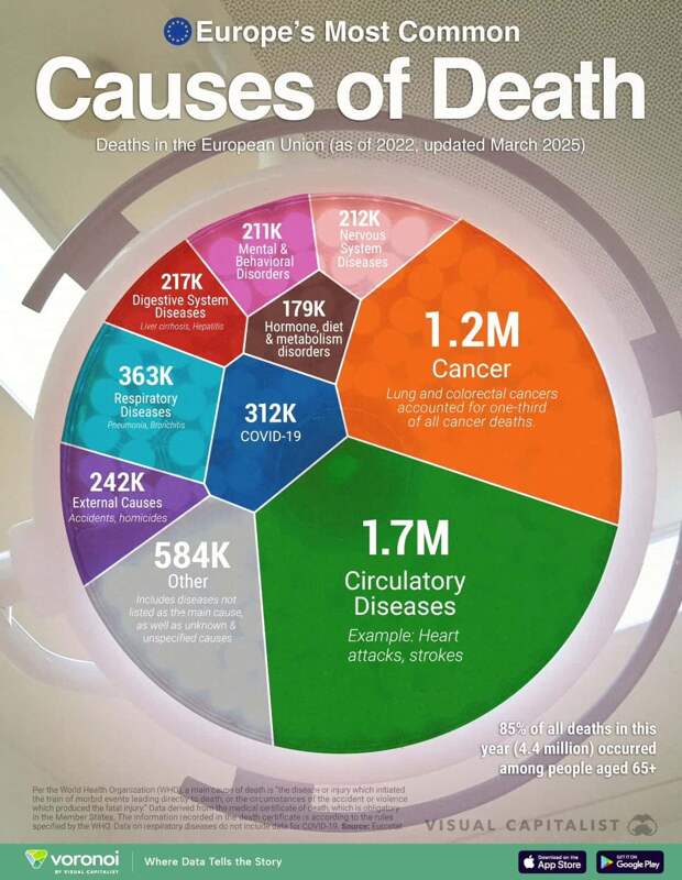 Статистика: самые распространенные причины смертности в Европе / © Visualcapitalist Смертность от сердечно-сосудистых заболеваний сильно коррелирует с возрастом: люди старше 65 лет составляют примерно девять из десяти этих случаев. Для справки: 85 % всех смертей в 2022 году (4,4 миллиона) произошли среди людей старше 65 лет.