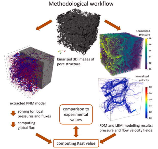 «Можно пойти и дальше — на основе разрабатываемых методик можно создавать дизайнерские почвы с идеальными физическими свойствами для определенных культур и условий окружающей среды»,— добавил Кирилл Герке, директор по науке Центра вычислительной физики. Традиционные подходы к изучению почвы, такие как отбор образцов для измерения в лаборатории, являются разрушающими, медленными и потенциально вносят ошибки из-за проблем измерительных протоколов. Более того, экспериментальный метод ограничивает движение воды в почве, блокируя боковые потоки, и не позволяет получить полную информацию о фильтрационных характеристиках пористой среды. Ученые из ЦВФ МФТИ с коллегами предлагают принципиально другой подход к изучению свойств почвы, который позволит исследовать ее виртуально с более полной информацией о свойствах. Очень важен параметр насыщенной гидравлической проводимости почвы — величина, показывающая, как быстро вода может просачиваться и распределяться по почве. Этот параметр позволят определять продуктивность почвы для сельского хозяйства, риски эрозии и наводнения и способность почвы справляться с экологическими последствиями. Общая схема сравнительной части исследования / © Kirill M. Gerke et al., Soil and Tillage Research Ученые создали 3D-структуру на уровне пор для трех образцов почвы Суздальского ополья с помощью изображений рентгеновской микротомографии. Они применили три принципиально разных метода моделирования для расчета гидравлической проводимости. Несмотря на то что методы имеют различные фундаментальные подходы, результаты моделирования совпадают по порядку величины с экспериментом. Что подтвердило надежность цифрового моделирования. Исследователи сравнивали расчетные и экспериментальные значения насыщенной гидравлической проводимости. Модельные значения оказались в 2–10 раз больше полевых. Ученые объясняют, что различия обусловлены ограничениями рентгеновской компьютерной томографии, а также сложностями в создании одинаковых граничных условий в численном и полевом экспериментах. Цифровой подход открыл новые задачи в выявлении причин расхождения, такие как необходимость учета разных масштабов в структуре почвы, выявление органики, расположенной в порах почвы. Благодаря моделированию впервые удалось подчеркнуть анизотропность почвы — ее способность проводить воду по-разному в различных направлениях. Этот эффект сложно исследовать экспериментальными методами. «Безусловно, как у и любой модели, у нашей тоже есть ограничения. Мы используем статические данные о структуре полученные с помощью компьютерной томографии при определенном насыщении почвы водой. При изменении влажности структура, в которой происходит фильтрация, меняется. Для учета влияния этих факторов нам необходимо описать динамику структуры при изменении влажности. Совместив две модели: модель фильтрации и динамики структуры, мы сможем впервые детально описать процессы в реальных природных объектах, что будет значительным шагом вперед»,— добавил Кирилл Герке. Исследование демонстрирует потенциал моделирования как надежного и неразрушающего инструмента для исследования почвы. В работе участвовали ученые из Центра вычислительной физики МФТИ, Института физики Земли РАН, Университета короля Абдаллы (Саудовская Аравия), МГУ, Ле