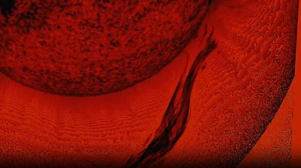 Выброс солнечной плазмы / © xras По данным ученых, в ночь с 14 на 15 июля около южного полюса Солнца произошёл выброс, который, вместо естественной для этого положения траектории, направленной вправо и вниз, полетел в противоположную сторону — словно отразившись от невидимой преграды. © xras Это произошло из-за воздействия магнитных полей, которые изменили привычный путь выброса.