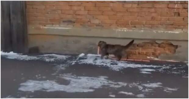 Котик "купил" где-то сосисок, но пакетов на кассе не оказалось. Однако его это ни капли не смутило.