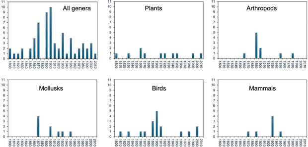 Оказалось, с 1500 года вымерло лишь 102 известных биологам рода, причем 90 из них — среди животных, лишь 12 среди растений. Среди семейств (объединяют роды) эти события еще реже: их погибло 10, причем все были крайне немногочисленными по числу видов, что в норме для семейств не свойственно. Четыре из пяти среди них вообще имели всего один вид, а три четверти были островными эндемиками, особо уязвимыми к вымиранию, но слабо влияющими на биосферу в целом. Если же исследователи брали не высшие наземные животные, а, например, рыб, частота вымираний резко падала. Из тысяч родов лучеперых рыб вымерло всего четыре рода, из амфибий — один. Членистоногие показали всего 11 вымерших родов, хотя их многие тысячи. Всего биологам известно приблизительно 209 тысяч родов, из которых 22 760 наблюдались в смысле вымираний. Самым важным выводом научной работы оказался другой: за последние 100 лет вымирания стали существенно реже, чем были ранее. Причем это относится к самым разным группам животных. На этой основе биологи отвергли выводы других научных групп, озвученные ранее. Цифры не показывают никакого ускорения вымирания, которое регулярно озвучивают в медиа — на деле происходит обратный процесс. По всей видимости, вымирание наиболее уязвимых островных эндемиков уже состоялось, а вне островных экосистем они были редки и до этого. Скорость вымирания родов (а не только видов) падает, а не растет, как утверждали ранее / © Wiens et al. Ученые констатировали, что наблюдаемая скорость исчезновения родов не показывает ускоренного вымирания, которое можно было бы назвать массовым. Хотя они воздержались от определения «мусорная наука», которое выдвинул в отношении работ о шестом массовом вымирании палеонтолог, результат нового исследования явно противоречит идее о том, что подобное событие реально происходит. Напомним, если бы оно происходило, заботиться о существовании других видов было бы уже поздно по причинам, описанным здесь. Отсутствие шестого массового вымирания, таким образом, придает смысл продолжающимся усилиям по сохранению живой природы.
