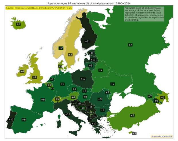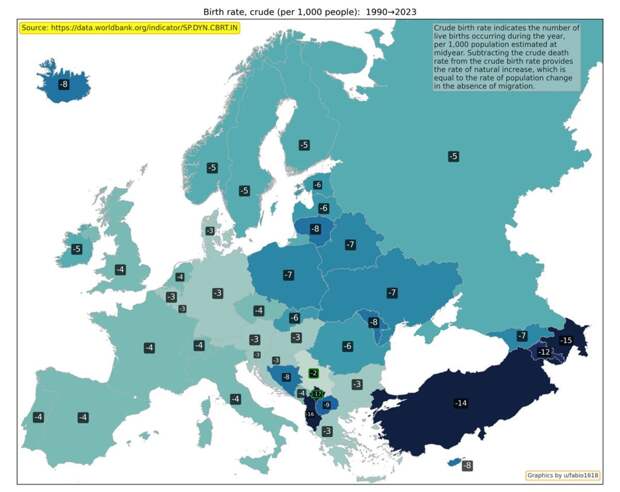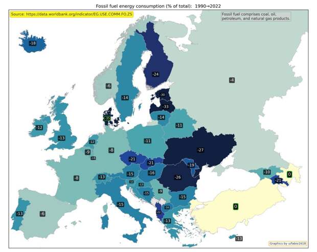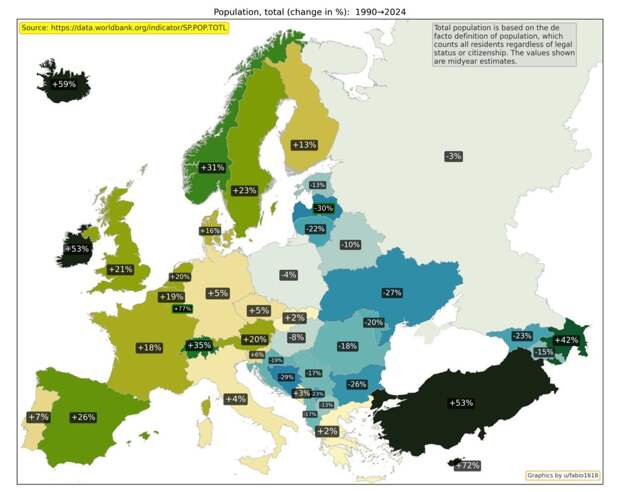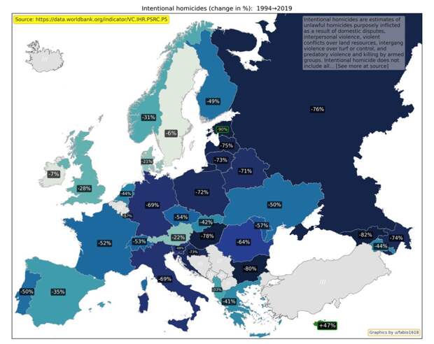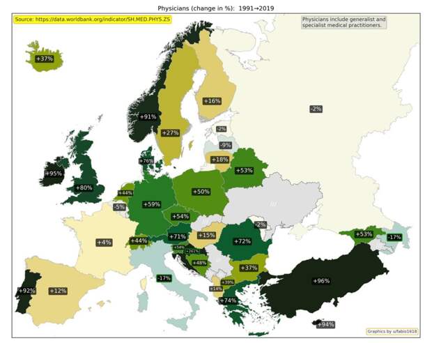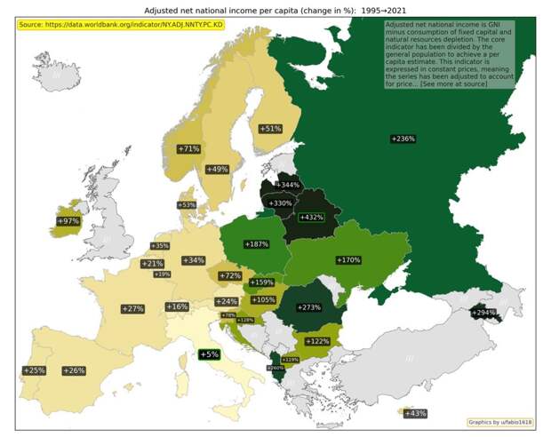 Изменение ВВП на душу населения с 1995 по 2022 год / © Worldbank, u/fabio1618 Валовой внутренний продукт на душу населения — один из основных показателей развития экономики страны. Сильнее всего ВВП вырос в Боснии и Герцеговине, Грузии, Армении и Азербайджане. Наименьший прогресс оказался у Италии. Изменение скорректированного чистого национального дохода на душу населения с 1995 по 2021 год / © Worldbank, u/fabio1618 Скорректированный чистый национальный доход на душу населения — еще один важный показатель благосостояния населения. Наибольший рост показали страны Балтии — Литва, Эстония и Латвия. Как изменилось использование энергии с 1990 по 2022 год / © Worldbank, u/fabio1618 Показатель использования энергии отражает, сколько первичной энергии использовали до ее преобразования в другие виды топлива, к примеру, бензин. Рост потребления может быть связан с экономическим ростом, однако снижение может говорить о переходе на возобновляемые источники. Лидером по росту энергопотребления вновь оказалась Турция. Изменение потребления энергии из ископаемого топлива с 1990 по 2022 год / © Worldbank, u/fabio1618 Потребление энергии из ископаемого топлива показывает, какую часть всей потребляемой энергии составляют уголь, нефть, нефтепродукты и природный газ. Сильнее всего этот показатель уменьшился у Дании, Латвии и Эстонии. Изменение государственного долга к доле от ВВП с 1995 по 2024 год / © imf, u/fabio1618 Государственный долг к доле от ВВП больше всего вырос в Украине, Великобритании и Франции. Изменение общей численности населения с 1990 по 2024 год / © Worldbank, u/fabio1618 Общая численность населения учитывает всех жителей страны, вне зависимости от их правового статуса или гражданства. Сильнее всего с 1990 по 2024 год выросло население Кипра, Ирландии, Исландии и Турции. Изменение доли населения в возрасте 65 лет и старше с 1990 по 2024 год / © Worldbank, u/fabio1618 Доля населения в возрасте 65 лет и старше показывает, какая часть всех жителей страны относится к этой возрастной группе. Сильнее всего показатель вырос в Боснии и Герцеговине, Албании и Хорватии. Изменение числа врачей с 1991 по 2019 год / © Worldbank, u/fabio1618 Изменение числа врачей показывает, как меняется доступность медицинской помощи. Показатель учитывает терапевтов и специалистов узкого профиля. Наиболее сильно число врачей выросло в Хорватии, Турции и Ирландии. Динамика совершения умышленных убийств с1994 по 2019 год / © Worldbank, u/fabio1618 Показатель «умышленные убийства» не учитывает убийства, совершенные по неосторожности или при самообороне. С 1994 по 2019 год число убийств сильнее всего уменьшилось в Эстонии, Грузии и Болгарии. Изменение ожидаемой продолжительности жизни с 1990 по 2023 год / © Worldbank, u/fabio1618 Ожидаемая продолжительность жизни при рождении показывает, сколько в среднем проживет новорожденный, если нынешний уровень смертности не изменится. Сильнее всего этот показатель вырос у Азербайджана, Армении, Турции и Эстонии. Изменение рождаемости с 1990 по 2023 год / © Worldbank, u/fabio1618 Рождаемость уменьшилась во всех странах Европы. Наиболее сильно показатель рождаемости на тысячу человек упал в Албании, Косово и Азербайджане.