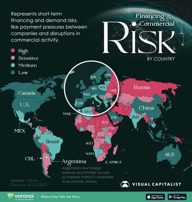 Карта мирового финансового риска на 2025 год / © Visualcapitalist Эта инфографика, основанная на данных Allianz Trade, визуализирует глобальный ландшафт краткосрочного финансового и коммерческого риска на 2025 год. Рейтинг краткосрочного риска оценивает вероятность невыплаты компаниями в конкретной стране, используя два показателя: потоки финансирования и сбои в спросе.