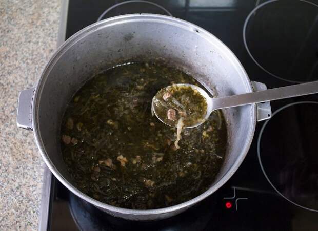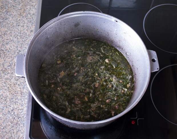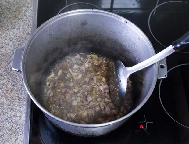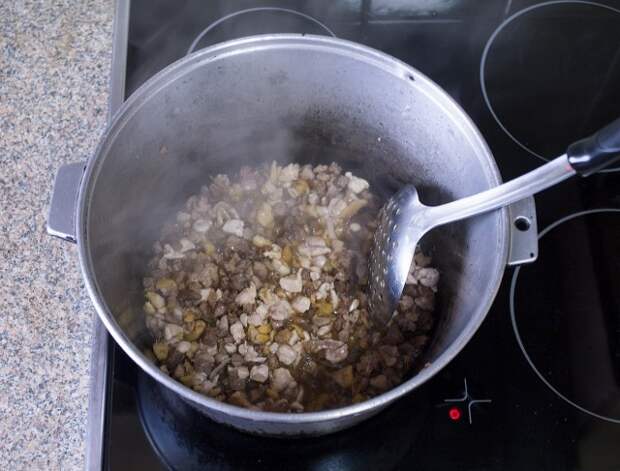 Через короткое время вольем воды, убавим огонь, подровняем соль и пусть зирвак варится