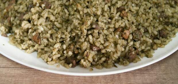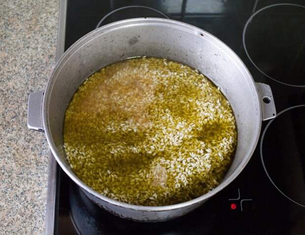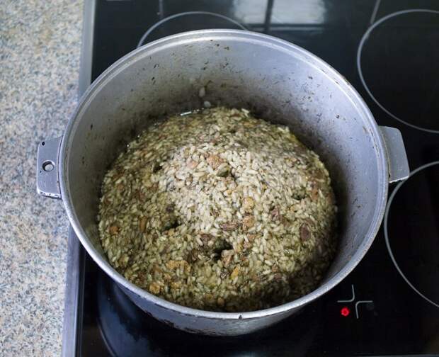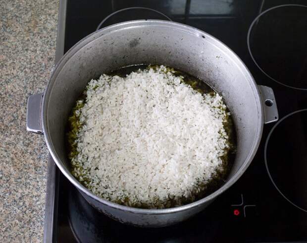 Когда рис слегка не доварился, содержимое казана хорошенько перемешиваем и соберем все горкой
