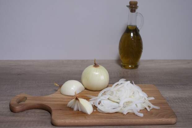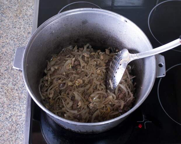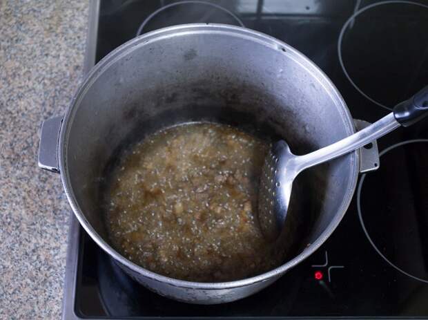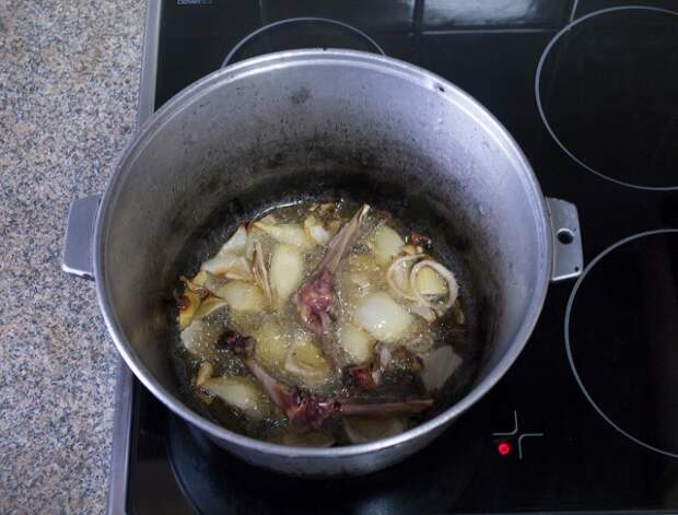 Сначала калим масло, как накалится хорошо, закинем для этого выделенный лук и кости от ног, пережарим все это и выбросим