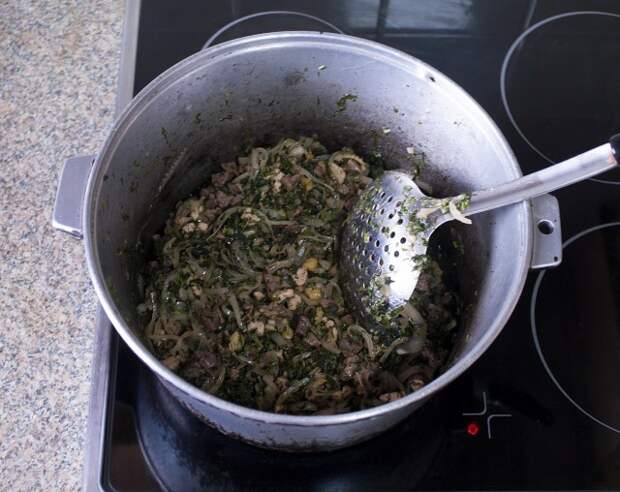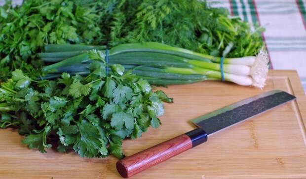 Так же режем зелень, мелко. Бытует мнение, что чем больше зелени, тем и лучше - это не так. Всего должно быть в меру. Например, в моем случае, а это полкило печени и полкило мяса да риса 600 - 700 гр; использовались: 3 пучка кинзы, пучок зеленого лука, 1 пучок петрушки и 1 пучок укропа. На самом деле цвет, аромат и вкус бахшу придаст зирвак и достаточное время для его приготовления