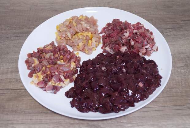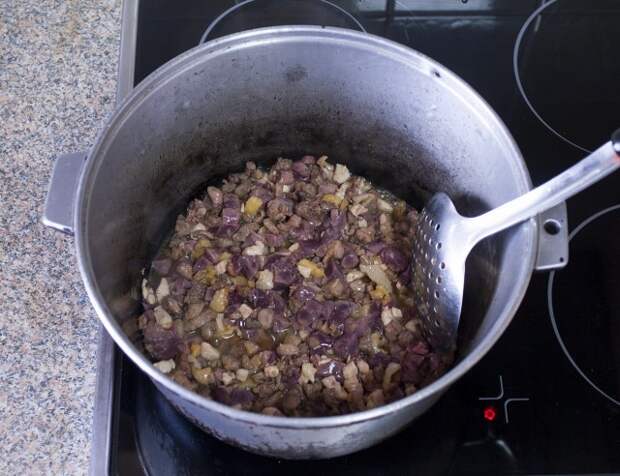 Мясо с ножек срезаем и мелко нарезаем, так же нарезаем и все остальное. Кстати, цветовая гамма мяса должна будет остаться уже и в готовом блюде