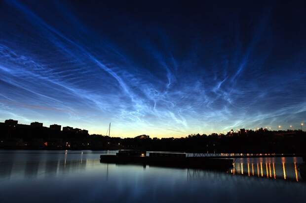 Серебристые облака представляют собой едва заметные светящиеся слои бледно-голубого цвета. Характерный синий возникает из-за поглощения озоном на пути солнечного света, освещающего облако. Они могут выглядеть как невыразительные полосы и разнообразные волны. Эти облака состоят из микроскопических ледяных кристаллов, которые образуются при конденсации водяного пара на частицах метеорной пыли, попадающей в верхние слои атмосферы. Именно эти крошечные частицы служат основой для ледяных структур, создающих необычное свечение. Феномен «свечения» возникает в мезосфере — самом верхнем слое атмосферы на высоте около 80 км, где температура опускается до -120°C. Такой экстремальный холод возникает только летом, когда восходящие воздушные потоки выталкивают тепло вверх, где оно буквально «утекает» в космическое пространство из-за отсутствия плотных воздушных слоев. Зимой же циркуляция воздуха меняется, мезосфера становится теплее, и условия для формирования этих облаков исчезают. — В отличие от обычных облаков, которые мы видим днем, серебристые видны только в глубоких сумерках, когда солнце уже зашло за горизонт на 6-16 градусов, но продолжает подсвечивать их снизу (примерно с 22:00 до 23:00). Тогда они светятся чаще всего призрачным голубовато-серебристым светом. При этом их структура настолько тонка и прозрачна, что ночью сквозь них легко различаются звезды, — рассказал Евгений Бурмистров, эксперт в области астрономии Пермского Политеха. Серебристые облака над озером Сайма, Финляндия / © Mika Yrjölä. english wikipedia Примечательно, что первые документальные свидетельства этого явления появились лишь в 1885 году, что заставило исследователей связать их появление с извержением вулкана Кракатау двумя годами ранее. Это катастрофическое событие, во время которого в атмосферу попало колоссальное количество вулканического пепла (около 35 миллионов тонн) и водяного пара, что могло создать условия для формирования необычных облаков. Однако существуют и другие теории происхождения: некоторые ученые рассматривают влияние человеческой деятельности и даже гипотетический «солнечный дождь». — В последнее время серебристые облака стали появляться значительно чаще. Это связано с глобальными климатическими изменениями и повышением уровня влажности в верхних слоях атмосферы. Особенностью нынешнего сезона стала необычайная продолжительность ночного свечения: первые случаи наблюдения зафиксировали еще в мае, а последние ожидаются в конце августа, — объясняет эксперт ПНИПУ. Видимость светящихся образований существенно варьируется в зависимости от местоположения территории. Наиболее благоприятные условия складываются в северных широтах — жители Москвы, Санкт-Петербурга, Урала и Сибири имеют значительно больше шансов стать свидетелями природного явления. В арктических областях в летние месяцы облака превращаются в почти обыденное событие, украшая небо практически каждую безоблачную ночь. В то же время в южных регионах (Крым, Краснодар) шансы их увидеть крайне малы — здесь они появляются эпизодически, преимущественно в зимний период (декабрь-январь), когда создаются особые атмосферные условия. Интересно, что подобные свечения были обнаружены и на Марсе. В 2021 году марсианский зонд NASA зарегистрировал в атмосфере соседней планеты структуры, пор