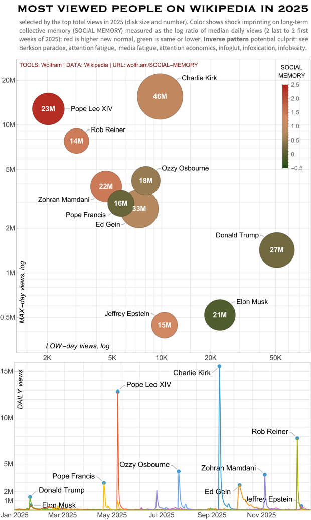 Самые просматриваемые страницы людей в Википедии в 2025 году. Совокупные просмотры за год и пиковые просмотры за один день / © Vitaliy Kaurov, Wolfram Директор по вовлечению Wolfram Виталий Кауров, изучив статистику просмотров страниц Википедии, проанализировал, какие события влияли на интерес пользователей.