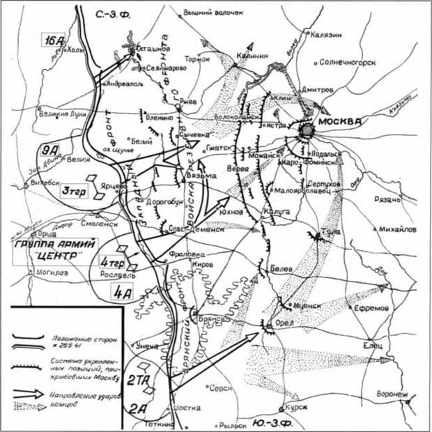 С 30 сентября по 5 декабря 1941 года немецкие войска пытались наступать на Москву. Противостоявшие им здесь советские командиры фронтов — Конев, Еременко и Буденный «не увидели» ударные группировки противника. Поэтому многочисленные советские силы — 1,25 миллиона человек, тысяча танков, 1370 самолетов — получили удары немецкими клиньями по самым слабым точкам своего фронта, где войск было немного.