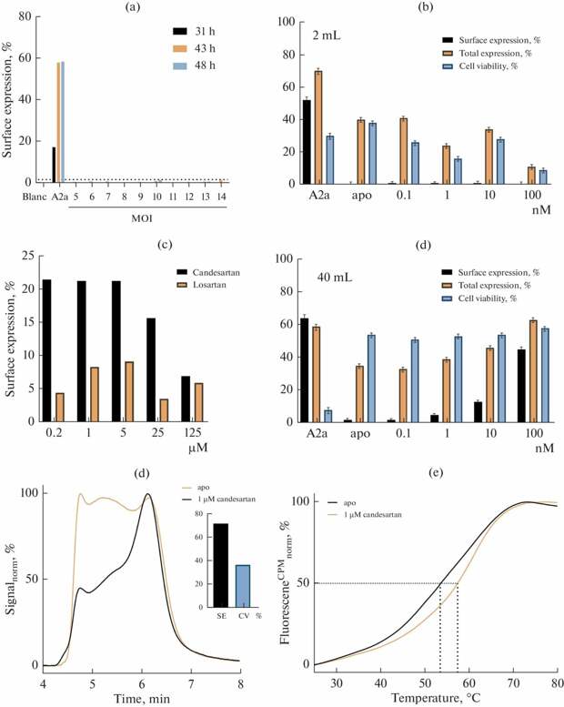Все это определяет исключительное значение таких белков для биологии и медицины. Чтобы использовать GPCR в эксперименте, их необходимо получить в чистом виде. Для этого их экспрессируют в культивируемых клетках, а затем экстрагируют, переводя в растворимую форму и очищая от примесей. Непростая задача, ведь биологические молекулы могут быть нестабильными и разрушаться в неестественных условиях. Отсюда возникает необходимость оптимизации стандартных протоколов наработки рекомбинантных белков, и GPCR — не исключение. Проблемой занялись исследователи из МФТИ, ОИЯИ (Россия, Дубна) и Чжэцзянского университета (Zhejiang University, Китай). Ученые разработали оптимальную технологию получения рецептора ангиотензина II первого типа АТ1. Он связывает ангиотензин — пептидный гормон, который вызывает сужение сосудов, повышение кровяного давления и высвобождение альдостерона — гормона коры надпочечников. Результаты опубликованы в журнале «Биохимия». Современные методы исследования требуют выделения больших количеств рецептора AT1 в чистом виде, например чтобы установить структуру белковой молекулы в высоком разрешении с помощью рентгеноструктурного анализа (РСА). Для этого рецептор необходимо экспрессировать в клеточных культурах. Клетки млекопитающих не годятся для этих целей, поскольку они медленно делятся и не позволяют получить достаточное количество белка. Поэтому ученые МФТИ использовали более подходящую клеточную культуру Sf9, исходно полученную из куколок бабочки Spodoptera frugiperda (кукурузная лиственная совка). Биофизики отметили, что при экспрессии аминокислотную последовательность AT1 в клетках насекомого следует модифицировать: требуется добавить апоцитохром b562RIL, сократить N-концевой домен и внести ряд мутаций. Эти изменения необходимы, чтобы придать AT1 термостабильность. К тому же белок следует солюбилизировать, то есть перевести в растворимую форму. Рецептор AT1 крайне нестабилен в водных растворах, и это немало осложняет задачу. Далее исследователи оптимизировали экспрессию AT1 в клетках линии Sf9. Для оценки ее эффективности использовали долю рецептора на мембране клетки, поскольку его направленный перенос туда напрямую связан с правильным сворачиванием белка и посттрансляционными модификациями. Затем экспрессия рецептора была усилена за счет добавления в среду культивирования его лиганда (кандезартана). Выяснилось, что наработка AT1 в клетках насекомого без этого соединения невозможна. Это связано с нарушением сворачивания белка и его дальнейшего транспорта в клеточную мембрану. Оптимизация экспрессии AT1. (a) Изменение MOI и времени инкубации во время экспрессии AT1 в отсутствие лиганда. Blanc представлен нетрансфицированными клетками и служит отрицательным контролем; A2a является стабильно экспрессирующим GPCR, служащим положительным контролем экспрессии. Пунктирная линия указывает на уровень поверхностной экспрессии 2%. (b) Изменение концентрации кандесартана от 0,1 до 100 нМ для повышения уровня SE в 2 мл ( вверху ) и 40 мл ( внизу ) культуральной среды. Рецептор A2a использовали в качестве положительного контроля экспрессии. (c) Сравнение влияния кандесартана и лозартана на уровень поверхностной экспрессии путем изменения его концентрации от 0,2 до 120 мкМ в 2 мл культуральной среды. (d) Профили SEC AT1 WT показали, что добавление 1 мкМ канд