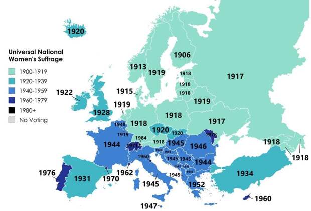 Карта: когда женщина получили право голоса в Европе / © Reddit До XIX века женщины практически не могли участвовать в выборах. Хотя некоторые страны это право предоставляли, оно ограничивалось имущественным цензом или социальным статусом. Повсеместное избирательное право европейки получили только в XX веке.