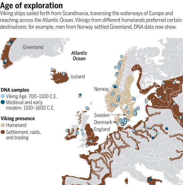 Инфографика: пути викингов и места, где собирали образцы их ДНК / © Nature Бытует мнение, что викинги — это особая этническая или региональная группа людей. Однако обширное исследование древней ДНК, опубликованное в журнале Nature, показало генетическое разнообразие людей, которых принято называть викингами.