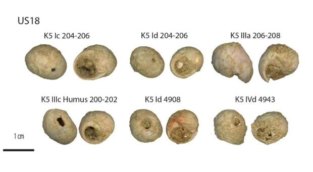 Проколотые раковины Littorina obtusata, обнаруженные вместе с шательперонскими каменными орудиями / © National Academy of Sciences Мастерскую обнаружили на палеолитическом памятнике Ла-Рош-а-Пьерро в Сен-Сезере (Приморская Шаранта). Исследователи отнесли находку к шательперонской культуре, которая связана с переходным периодом между последними неандертальцами и появлением Homo sapiens в Европе.