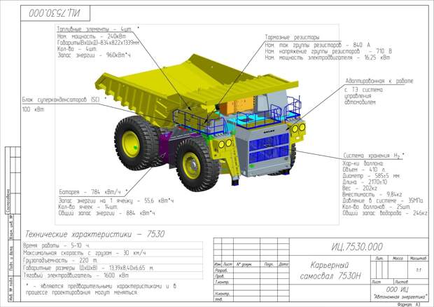 Трансмиссия передает механическую энергию от двигателя к колесам, подъемнику кузова и другим исполнительным устройствам самосвала. Помимо трения и зацепления между агрегатами в гидромеханической трансмиссии энергия передается потоком жидкости, а в электромеханической — электромагнитным полем. Последнее позволяет в широком диапазоне варьировать крутящий момент двигателя и силу тяги, что важно для обеспечения комфортной и безаварийной эксплуатации транспортного средства. Не менее значимый эффект от модернизации — повышение экологического класса самосвала. Принадлежность к тому или иному классу определяется содержанием в выхлопных газах вредных веществ: углеводородов, соединений серы, оксидов углерода и азота, а также твердых частиц. Образование продуктов сгорания, в свою очередь, зависит от вида топлива. Перспективное инженерное решение — перевод самосвалов на водород. В процессе горения водород превращается в водяной пар, выделяя около 120 МДж/кг. Для сравнения: в ходе аналогичных реакций с участием дизеля или сжиженного природного газа тепла выделяется почти в три раза меньше. Значительную долю карьерной техники наша страна закупает у Белорусского автомобильного завода (БелАЗа) — машиностроительного предприятия с более чем полувековой историей, которое выпускает самые большие самосвалы в мире. В связи с этим ученые из МФТИ взяли продукцию БелАЗа за основу и разработали проект карьерного самосвала с электромеханической трансмиссией, работающего на водородном топливе. За текущий и следующий год планируется изготовить и протестировать опытный образец. На самосвале БелАЗ-7530 установят генератор энергии на базе топливных элементов общей мощностью около 1 МВт, аккумуляторные батареи и суперконденсатор — электрохимическое устройство, состоящее из двух электродов и электролита между ними, которое быстро заряжается и разряжается. Наличие суперконденсатора в электрической цепи позволит даже при больших токах не терять, а аккумулировать энергию и обеспечивать ей электрооборудование самосвала, работающее в импульсном режиме. Горючее для транспортного средства будут получать при электролизе воды, то есть разложении ее на составляющие — водород и кислород — под действием электрического тока. Кроме того, источником водорода является отходящий газ металлургического производства, ученые предусмотрели его улавливание и очистку. Заряжать самосвал предполагается на водородной автозаправочной станции, где водород сожмут под высоким давлением и закачают в баллоны. «Увеличение грузоподъемности карьерных самосвалов позволяет задействовать в работе меньшее число техники и водителей,— пояснил Юрий Васильев, генеральный директор Инжинирингового центра „Автономная энергетика”, МФТИ.— Вместе с тем возрастают потери за каждый час простоя самосвала на ремонт или обслуживание». «Применение нашего инженерного решения для перевода карьерной техники с дизеля на водород снизит профессиональную заболеваемость работников горно-обогатительного комбината, а также увеличит межремонтный интервал и эффективность эксплуатации транспортных средств,— добавил Владислав Карасевич, директор по научной работе Инжинирингового центра „Автономная энергетика”, МФТИ. — Заправлять технику планируется низкоуглеродным во