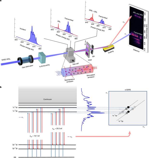 Европейский XFEL способен генерировать до 27 тысяч таких импульсов в секунду, что дало возможность опробовать на нем новый метод, названный стохастическим вынужденным рентгеновским комбинационным рассеянием (s-SXRS). Подробнее он описан в научной статье, опубликованной в журнале Nature. Ученые создали экспериментальную установку, с помощью которой направили пучки импульсов рентгеновского лазера XFEL на неоновую газовую ячейку. Проходя через газ, те вызывали ответные — рамановские — сигналы электронов в атомах неона, которые усиливались почти в миллиард раз и проходили через решетчатый спектрометр, разделяющий свет на различные длины волн. Используя 18 тысяч одиночных импульсов, исследователи превзошли инструментальное разрешение по энергии 0,2 электронвольта, тем самым создав условия сверхвысокого разрешения. Они аналогичны условиям сверхвысокой флуоресцентной микроскопии, за развитие которых в 2014 году присуждена Нобелевская премия по химии. Таким образом, новый метод значительно повысил детализацию рентгеновской спектроскопии, изучающей расположение электронов вокруг атомных центров. Применение предложенной генерации чрезвычайно коротких рентгеновских импульсов длительностью менее одной фемтосекунды дает понимание динамики сложных химических реакций, что открывает новые возможности в материаловедении.