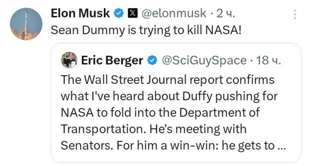 В ответ Маск заявил, что Даффи хочет убить агентство. Он также исказил фамилию исполняющего обязанности главы NASA, назвав его Dummy, что можно перевести как «болван», «чучело», а в случае художественной интерпретации подойдет вариант «дубинушка». Скриншот публикации Илона Маска в соцсети X Вскоре Маск также опубликовал опрос, в котором иронически затронул уровень профессионализма Даффи. Он поинтересовался, должен ли кто-то, чьим самым высоким достижением на пути к славе было залезание на дерево, возглавлять американскую космическую программу. Шон Даффи в прошлом был профессиональным лесорубом, участвовавшим в городских турнирах. Также он занимался скоростным лазанием по столбам и побеждал на соревнованиях. Он получил степень бакалавра по маркетингу в колледже Святой Марии и степень доктора юридических наук в колледже Уильяма Митчелла. Как писал The Wall Street Journal, Даффи сейчас является исполняющим обязанности NASA, но хочет в будущем возглавить агентство. На должность также претендует Джаред Айзекман, совершивший две миссии на SpaceX. Айзекман — основатель компании по обработке платежей Shift4 Payments, миллиардер и близкий союзник Илона Маска. По данным издания, оба активно продвигают свои кандидатуры. Тем временем Даффи обсуждал с правительственными чиновниками возможность перевода NASA в компетенцию Министерства транспорта. По словам представителя NASA, Даффи действительно заявил, что агентство может получить выгоду, став частью Кабинета министров или войдя в состав Министерства транспорта. При этом, как утверждает собеседник издания, Даффи никогда не говорил, что хочет руководить агентством.