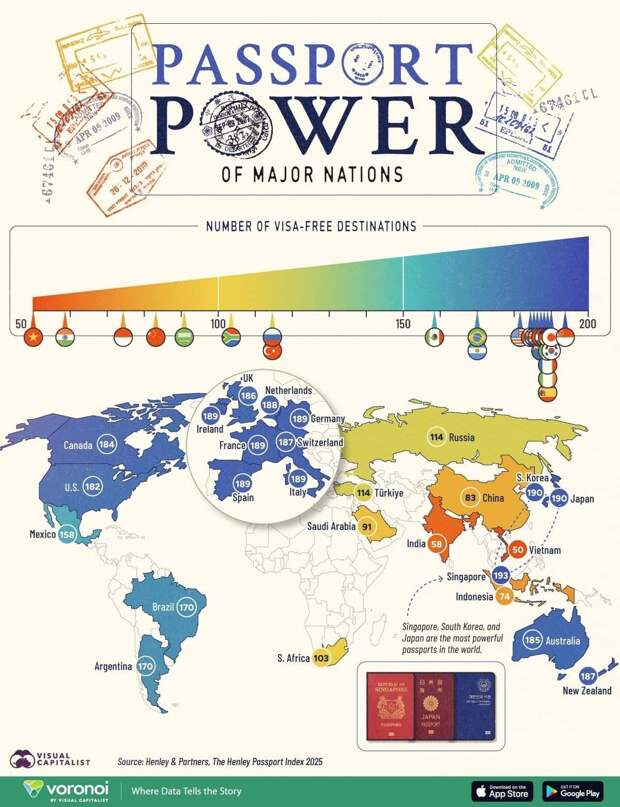 Карта: самые влиятельные паспорта крупнейших стран в 2025 году / © Visualcapitalist Сила паспорта отражает дипломатическое влияние страны и, как следствие, глобальную мобильность, которую паспорт обеспечивает ее гражданам. В инфографике, представленной выше и основанной на данных международной компании Henley & Partners, оценивается сила паспортов крупнейших стран в 2025 году по количеству безвизовых направлений, доступ к которым предоставляет каждый паспорт.