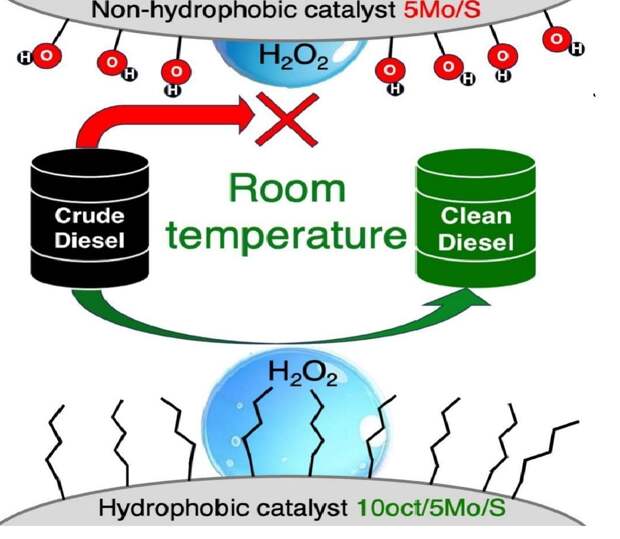 Вместе с тем требования к качеству топлив постоянно ужесточаются, чтобы уменьшить воздействие на окружающую среду при их сгорании. Прежде всего, жесткие ограничения накладываются на содержание серы: при сгорании серосодержащих соединений образуются вредные летучие вещества, в частности оксиды серы, которые ухудшают качество воздуха и могут приводить к кислотным дождям. Поэтому современные экологические нормы ограничивают содержание серы в широко используемом моторном топливе класса 5 до 10 миллионных долей (10 миллиграммов на килограмм топлива и менее). Чтобы соблюсти эти нормы, нефтеперерабатывающие компании очищают топливо от серы. Традиционно для этого используют гидроочистку — технологию каталитической обработки топлива при высоких температуре и давлении водорода. Однако такой способ энергозатратен и не всегда справляется с трудноудаляемыми соединениями серы — так называемой «остаточной» серой. В этом случае решением проблемы может стать окислительная десульфуризация — окисление серосодержащих соединений в присутствии катализаторов. Продукты такого окисления затем удаляют из топлива экстракционными методами. Ключевой задачей при этом остается разработка катализаторов, позволяющих эффективно и быстро окислять серу в «мягких» условиях. Химики из Московского государственного университета имени М.В. Ломоносова (Москва) и Российского государственного университета нефти и газа имени И.М. Губкина (Москва) разработали эффективные и стабильные катализаторы, позволяющие очищать нефтяные фракции от соединений, содержащих серу, при комнатной температуре. Аргам Акопян, доктор химических наук, доцент кафедры химии нефти и органического катализа химического факультета МГУ имени М.В. Ломоносова и Роберт Мустакимов, аспирант кафедры химии нефти и органического катализа химического факультета МГУ имени М.В. Ломоносова / © Пресс-служба РНФ За основу авторы взяли традиционный для промышленных катализаторов носитель — оксид алюминия, к поверхности которого в разных количествах химически «пришили» оксид молибдена и сульфогруппы, которые служат активными центрами и обеспечивают превращение сероорганических соединений. Затем на поверхности полученных материалов «закрепили» гидрофобные («боящиеся» воды) органические молекулы. Это позволило избежать не только слипания частиц катализатора и тем самым повысить его активность, но и улучшить стабильность. Химики протестировали полученные катализаторы в реакции окисления образцов модельного — приготовленного с использованием отдельно взятых «чистых» химических соединений — и реального дизельного топлива. Модельное топливо представляло собой органический растворитель с определенным количеством наиболее трудно удаляемого серосодержащего соединения — дибензотиофена. Такой подход позволил изучить активность катализатора в контролируемых условиях без влияния сложного состава реального топлива. Дизельное топливо, использованное в работе, содержало смесь нескольких сероорганических соединений, а также другие стандартные для продуктов нефтепереработки компоненты. Эксперимент показал, что один из новых катализаторов всего за 15 минут при комнатной температуре (25°C) окисляет почти 100% серосодержащих соединений в модельном топливе и 78% — в реальном дизель