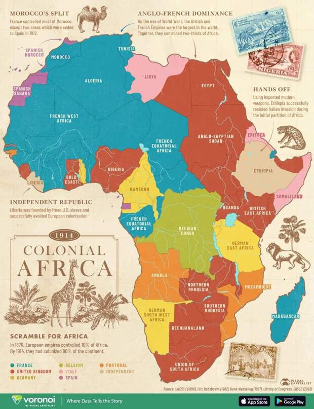Карта Африки в 1914 году: когда 90% континента находилось под колониальным владычеством / © Visual Capitalist Карта выше иллюстрирует момент наивысшего расцвета колониальной системы — накануне Первой мировой войны, когда европейская власть распространялась почти на всю Африку, прежде чем война начала разрушать заморские владения Европы.