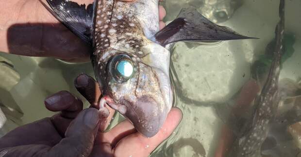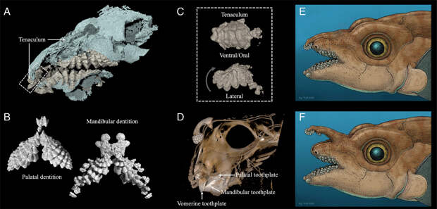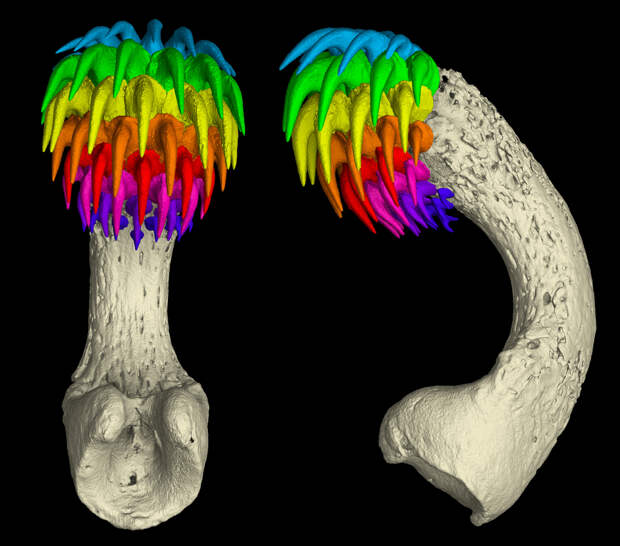 Эти случаи показывают, что генетическая программа для создания таких структур существует в организме, но в норме она активна только в строго определенных местах. В мире животных тоже встречаются странные образования. Глубоководные хрящевые рыбы химеры, или «призрачные акулы», — дальние родственники акул и скатов. У самцов этих рыб на лбу расположен странный булавовидный нарост, который они могут выдвигать из специального углубления. Этот орган, называемый «тенакулум», покрыт острыми шипами, похожими на зубы. Долгое время оставалось загадкой, чем на самом деле являются эти шипы: настоящими зубами или просто видоизмененными и заостренными чешуйками, похожими на наждачную бумагу, которая покрывает кожу акул. Ученые исследовали современных химер вида Hydrolagus colliei и ископаемые останки их древнего родственника Helodus simplex, жившего около 315 миллионов лет назад, чтобы изучить этот феномен. Результаты опубликованы в журнале Proceedings of the National Academy of Sciences. Компьютерная томография тенакулума взрослой самки пятнистого спинорога, покрытой рядами зубов (радужные цвета) / © Specimen scanned by Karly Cohen; rendering and image by Ella Nicklin Чтобы изучить строение и развитие тенакулума у современных рыб, применили гистологический анализ и компьютерную томографию. Главной целью было понять, формируются ли «лобные» зубы так же, как и ротовые. Ключевым маркером настоящего зуба служит наличие особой структуры — зубной пластинки. Также генетический анализ показал, что в клетках, формирующих тенакулум, активны те же гены, которые отвечают за развитие зубов во рту. Исследование ископаемых останков древней химеры Helodus simplex дополнило картину. Оказалось, что у этого вымершего вида тенакулум был гораздо длиннее и располагался вплотную к верхней челюсти. Вероятно, «зубообразующая» способность была эволюционно перенесена с челюсти на этот новый отросток. (A) Частично раздробленный череп Helodus simplex, на котором виден удлиненный тенакулюм с тенакулюмными зубами, расположенными перед небным зубным рядом и при сжатии помещающимися в щель между передними зубами нижней челюсти. (B) тенакулюмные зубные ряды (C) зубной ряд, нёбный и нижнечелюстной, с близко расположенными друг к другу зубными рядами, в которых зубы сменяются от язычного к губному, подобно зубным рядам современных акул и скатов. (D) H. colliei, пятнистая крылатка, с коротким тенакулумом современных химерообразных и зубным рядом. Тенакулум сохраняет наследственные черты, такие как отдельные зубные единицы, что отражает его происхождение от зубного ряда ротовой челюсти, а не от модификации кожных зубчиков. (E и F) Реконструкция H. simplex, демонстрирующая вероятное приподнятое и опущенное положение удлиненного примитивного тенакулюма. / © Karly E. Cohen et.al./PNAS(2025) В результате ученые подтвердили, что шипы на лбу химер — это настоящие зубы. Они развиваются из зубной пластинки, имеют полость с пульпой и состоят из дентина, как и зубы во рту. При этом кожные зубчики на других частях тела химер, например на тазовых выростах-класперах, формируются без участия зубной пластинки, как обычная чешуя. Это доказывает их разное происхождение. Исследователи также выявили интересный эволюционный парадокс: современные химеры утратили способность к смене зубов в челюстях, но сохранили ее на лбу. Это первый детально подтвержденный пример развития настоящих зубо