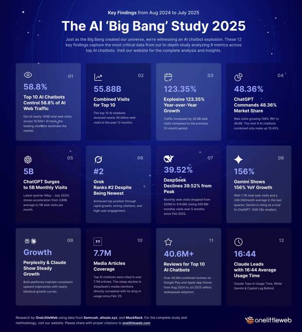 В исследовании OneLittleWeb оценивал позицию конкретного бота по совокупности факторов: веб-трафика, изменение показателей трафика к прошлому году, доле на рынке, средней длительности сессии, количеству упоминаний в прессе и количеству оценок в App Store. На долю ChatGPT пришлось 48,36% всего веб-трафика искусственного интеллекта. В среднем платформа собирает около 5 миллиардов визитов в месяц, при средней продолжительности сессии в 15 минут и 25 секунд. Второе место рейтинга занял Grog с 686,9 миллиона визитов за год. Этот показатель ниже, чем у многих соперников, но чат-бот продемонстрировал высокий годовой рост, а также часто упоминался в прессе. На третьем месте оказался Google Gemini с 1,66 млрд визитов. Его показатели посещаемости значительно выросли во втором квартале 2025 года. Следом идут Claude (1,15 миллиарда визитов) и DeepSeek (2,74 миллиарда визитов). Пик популярности китайского сервиса пришёлся на февраль 2025, потом его посещаемость резко пошла на спад. Это помешало DeepSeek подняться выше в рейтинге. Также в топ-10 вошли Perplexity, Microsoft Copilot, Poe, Mistral и Meta AI. Исследование The Big Bang of AI Chatbots / © OneLittleWeb Как отмечает OneLittleWeb, сейчас на рынке представлено более 10 500 инструментов искусственного интеллекта. С августа 2024 по июль 2025 года их суммарно посетили около 100 миллиардов раз.