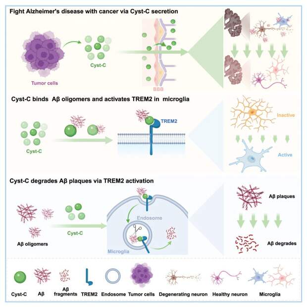 Основная причина болезни Альцгеймера — накопление в тканях мозга бета-амилоида. Этот белок склеивается в плотные бляшки, которые нарушают связь между нейронами, вызывают их гибель и приводят к потере памяти. Существующие препараты пытаются замедлить процесс, но редко добиваются успеха. Врачи предположили, что развитие опухоли запускает в организме мощные скрытые ресурсы очистки, заодно убирающие мусор из нервной системы. Команда китайских исследователей проверила эту теорию на животных. Результаты работы опубликовали в журнале Cell. Ученые работали с мышами, у которых генетически запрограммировали развитие болезни Альцгеймера. Грызунам пересадили клетки рака легких, толстой кишки и простаты. Появление опухоли любого типа вызвало быструю реакцию организма. Количество амилоидных бляшек в мозге животных резко уменьшилось. Биологи проанализировали состав крови и нашли причину изменений — белок цистатин-С. Раковые клетки выделяли это вещество в огромных количествах. Оно попадало в общий кровоток, преодолевало гематоэнцефалический барьер и проникало к очагам нейродегенерации. Графический абстракт статьи / Xinyan Li et al. / © Cell (2026). DOI: 10.1016/j.cell.2025.12.020 Внутри мозга цистатин-С работал как ключ зажигания. Он связывался со сгустками амилоида и одновременно соединялся с рецептором TREM2. Этот рецептор расположен на поверхности микроглии — главных иммунных клеток нервной системы. Белок переводил микроглию из спящего режима в боевой. Активированные иммунные клетки начинали поглощать и переваривать застарелые белковые отложения, расчищая ткани мозга. Чтобы доказать эффективность метода, биологи проверили память животных в водном лабиринте. Мыши должны были найти скрытую под водой платформу, чтобы спастись и выбраться на сушу. Больные грызуны обычно плавали кругами и не могли запомнить дорогу. Ситуация изменилась, когда животным ввели чистый цистатин-С или раствор с белками от раковых клеток. Оба варианта лечения восстановили когнитивные способности подопытных — они находили выход почти так же быстро, как здоровые особи. Эта научная работа открыла принципиально новый подход к лечению нейродегенеративных заболеваний. Большинство современных методик направлено на то, чтобы помешать образованию новых бляшек. Найденный механизм позволил эффективно уничтожать уже существующие скопления. Если клинические испытания на людях подтвердят эффект, врачи смогут создать лекарство, имитирующее защитное действие рака без развития самой опухоли.