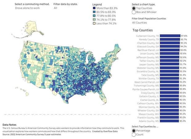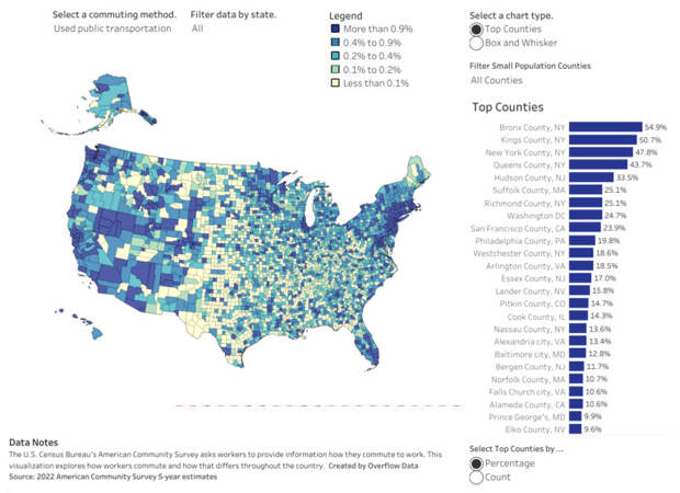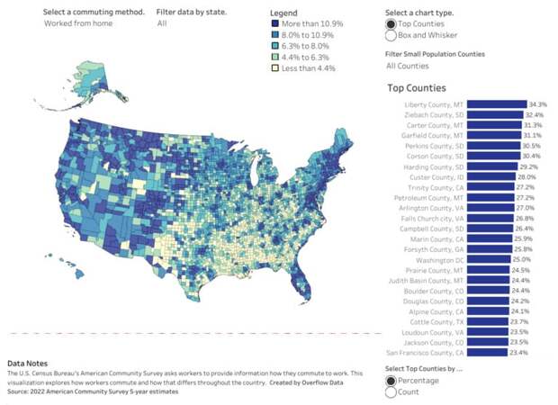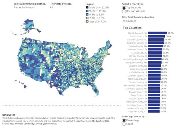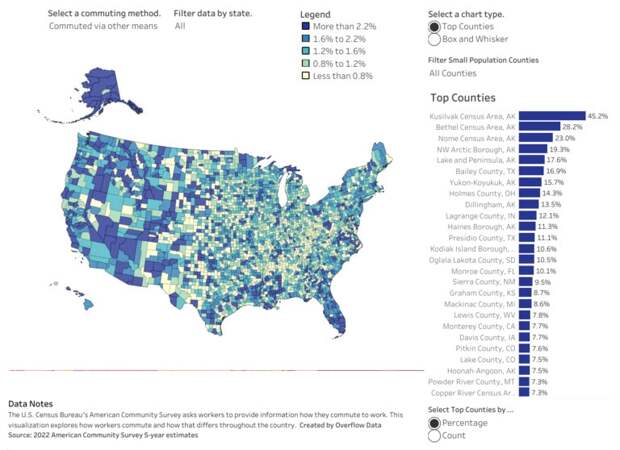 Общественный транспорт оказался самым популярным в Нью Йорке. После пандемии ситуация изменилась не сильно. Добираться до работы на автомобиле в одиночку предпочитают большинство американцев. Доля американцев, которые ездят на работу на автомобиле в одиночку / © Overflow Data Еще один популярный способ добираться на работу — на автомобиле совместно с другими пассажирами. Этот вариант оказался востребован, к примеру, в боро Денали на Аляске (31,7) и в техасском округе Форд (28%). Доля американцев, которые ездят на работу на автомобиле совместно с другими пассажирами/ © Overflow Data Общественный транспорт пользуется наибольшей популярностью в некоторых округах штата Нью-Йорк. Доля американцев, которые ездят на работу на общественном транспорте/ © Overflow Data На Аляске также сохраняют популярность прогулки. На Алеутских Восточных островах (Aleutians East Borough) добираются на работу пешком 52,7% жителей. Доля американцев, которые ездят на работу пешком/ © Overflow Data Другие способы добраться до работы вновь оказались наиболее востребованы на Аляске. Так в районе Кусилвак (Kusilvak Census Area) их используют 45,2% жителей. Доля американцев, которые добираются до работы другим способом / © Overflow Dat Достаточно популярным вариантом оказалась работа из дома. В некоторых округах популярность удаленной работы достигает 25-30%. Доля американцев, которые работают из дома / © Overflow Dat Вероятно, в сельских районах, таких как Монтана и Южная Дакота, люди могут работать на фермах и в семейных хозяйствах. В таких округах, как Марин (Marin County, CA) или Вашингтон (Washington DC), уже больше квалифицированных специалистов, к примеру, в сфере IT, которые могут работать из дома.