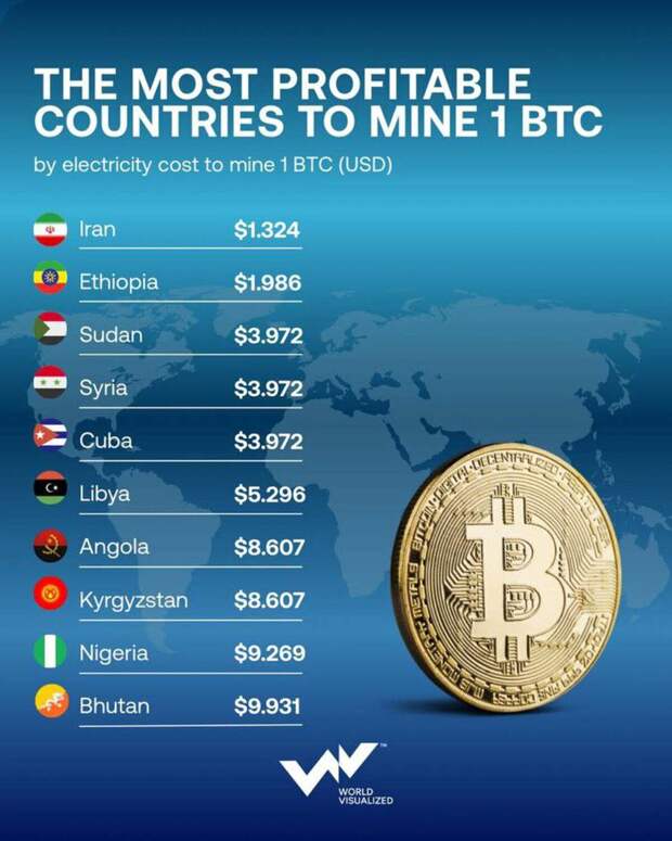 Карта прибыльного майнинга: страны-лидеры для добычи биткоина / © World Visualized Согласно представленному рейтингу, Иран занимает первое место — стоимость электричества для получения одного биткоина составляет всего 1,32 доллара США (около 103 рублей), за ним следует Эфиопия с показателем 1,99 доллара США.