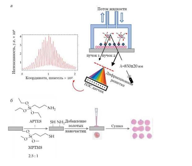 Эти интеллектуальные материалы показали семикратное увеличение скорости адсорбции при переключении молекулярных маяков из состояния «выключено» (без лиганда) в состояние «включено». «Это исследование является некоторым продолжением предыдущего проекта наших же ученых из МФТИ, которые разработали уникальный “умный” материал на основе явления “молекулярных маяков”. Новый материал позволяет проводить детекцию небольших молекул ДНК с высокой точностью и в небольших количествах, что было затруднительно при использовании более классических подходов. Исследование было опубликовано в ACS Nano. Наша работа — следующий этап, и была направлена на создание биосенсора, с использованием которого можно отслеживать процесс связывания умных материалов с молекулами ДНК», — рассказала об исследовании Елена Комедчикова, м.н.с. лаборатории биохимических исследований канцерогенеза МФТИ. В целом для экспресс-ДНК-диагностики ученые часто используют чувствительные к стимулам интеллектуальные материалы, которые активируются входными сигналами и остаются неактивными до их поступления. Подобные материалы представляют большой интерес для анализа биохимических данных. В процессе работы биофизики из лаборатории нанобиотехнологий МФТИ пришивали молекулу одноцепочечной ДНК одним концом на поверхность наночастиц. ДНК-молекула не имела двухцепочечных областей, образующихся за счет спаривания фрагментов своей же цепи (так называемых «шпилек»). На другой конец нити был пришит рецептор, распознающий маркеры на поверхности клеток, но который в ходе экспериментов не хотел связываться с мишенью. Ученые предположили, что на поверхности наночастицы одноцепочечная нить ДНК «прилипает» и самопроизвольно сворачивается в клубок, в результате чего рецептор «прячется». Гипотеза подтвердилась, когда к такой частице добавили другую небольшую нить ДНК, и рецептор мгновенно «активировался» и связывался с мишенью. В новом исследовании ученые из Института биофизики будущего МФТИ, Института общей физики им. А.М. Прохорова РАН и Отделения нанобиомедицины Научно-технического университета «Сириус» обратили внимание на важный показатель — взаимодействие между наночастицами и непосредственно молекулами организма (белками клеточной мембраны, нуклеиновыми кислотами и т.д.), так как эти параметры критичны для адресной доставки. Для оценки кинетики связывания обычно используют методы биосенсорного анализа. Также для моделирования измерений кинетики используют динамическое рассеяние света, флуоресцентную спектроскопию и гигантское магнитосопротивление. Однако все эти подходы имеют свои ограничения. Для создания более универсального метода биофизики из МФТИ с коллегами разработали безметочный оптический биосенсор на основе спектральной фазовой интерферометрии. Биосенсор позволяет измерять кинетику связывания и может применяться для различных материалов. Важно, что он может функционировать на поверхности обычного покровного стекла с нанесенным биослоем, что избавляет от необходимости использования дополнительных дорогостоящих покрытий. Биосенсор работает на основе интерференции света и позволяет в реальном времени измерять скорость взаимодействия наночастиц с его поверхностью, детектируя даже очень низкие концентрации ДНК — от 50 пМ